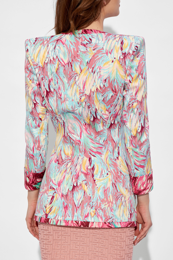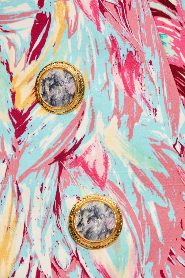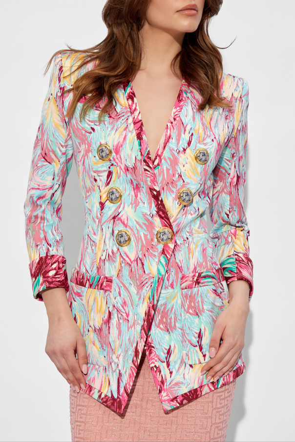 Introducing the Balmain Double-Breasted Blazer, an epitome of avant-garde elegance. Dominated by a vivacious pink hue, this blazer boasts an abstract pattern that interweaves shades of pink, blue, yellow, and red, creating a visually stunning piece. The fabric\'s slight sheen suggests a blend of high-quality materials with a silky finish, ensuring both comfort and a luxurious touch. The blazer\'s tailored design accentuates the waist, offering a feminine silhouette that exudes sophistication. Classic lapels and a double-breasted closure with ornate, textured buttons—outlined in gold and embellished with graphical or gemstone designs—add a layer of exclusivity to this exquisite garment. Long sleeves with versatile cuffs allow for varying lengths, enhancing the blazer\'s adaptability and style. The seamless continuation of the vibrant pattern across the back further underscores the meticulous craftsmanship of this piece. Additional features include two sleek slip pockets and subtly integrated shoulder pads, which combine functionality with fashion, ensuring a flawless fit and silhouette. Why Purchase This Product? Exceptional Design: A bold, abstract pattern and striking color scheme set this blazer apart. Luxurious Fabric: A high-quality, silky-smooth material promises both comfort and elegance. Exclusive Details: Ornate buttons and tailored fit offer a touch of sophistication and exclusivity. Versatility: Adjustable sleeve lengths and a design that complements any attire make this blazer a wardrobe essential.