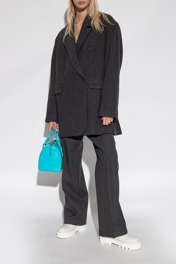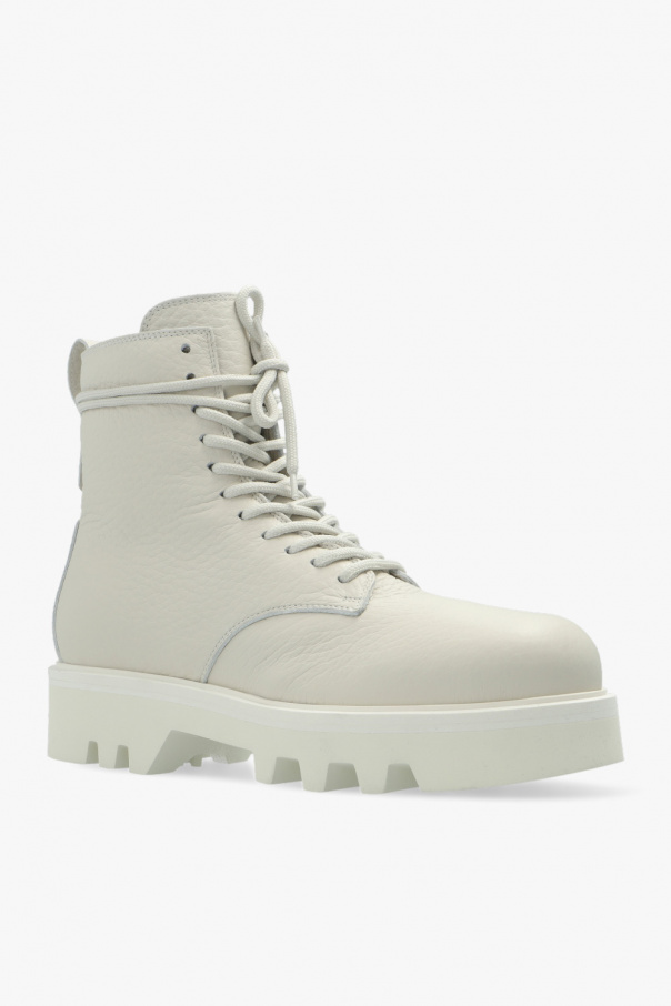 Cream ‘Rita Army’ ankle boots from Furla. Crafted from leather, this lace-up model sits on a white Vibram® rubber sole and features a side zipper and a back logo appliqué.
