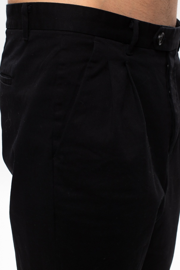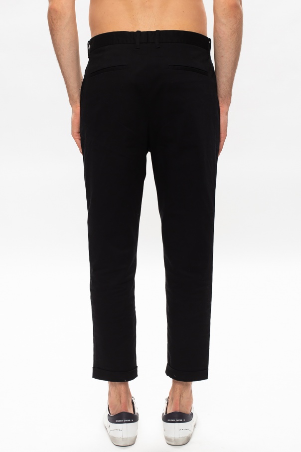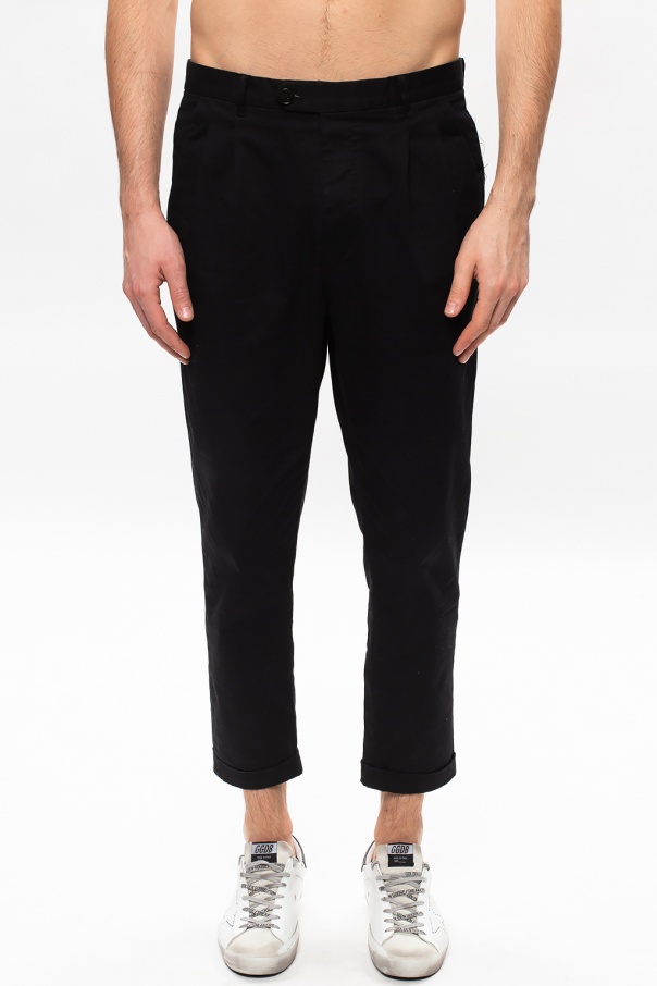 Black ‘Javan’ pleat-front trousers from AllSaints. Crafted from cotton, this tapered leg design features button and hook fastening as well as two front and two back pockets.