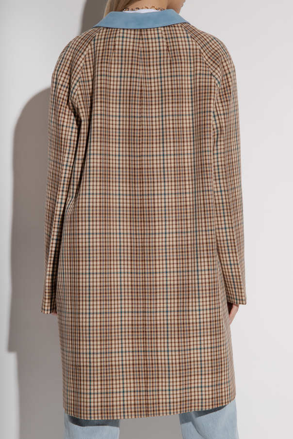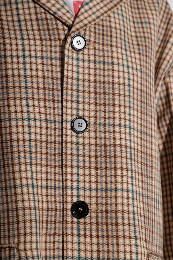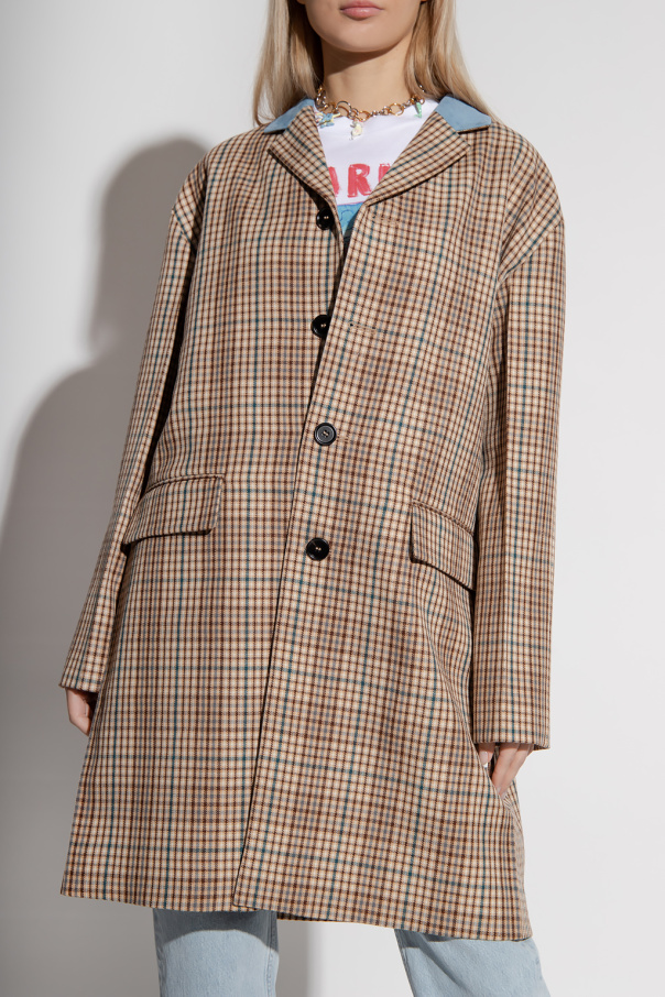 Beige coat from Marni. Crafted from virgin wool with a relaxed fit, this style features a colourful check pattern, button fastenings, a collar with notch lapels in blue, two flapped pockets and long sleeves.