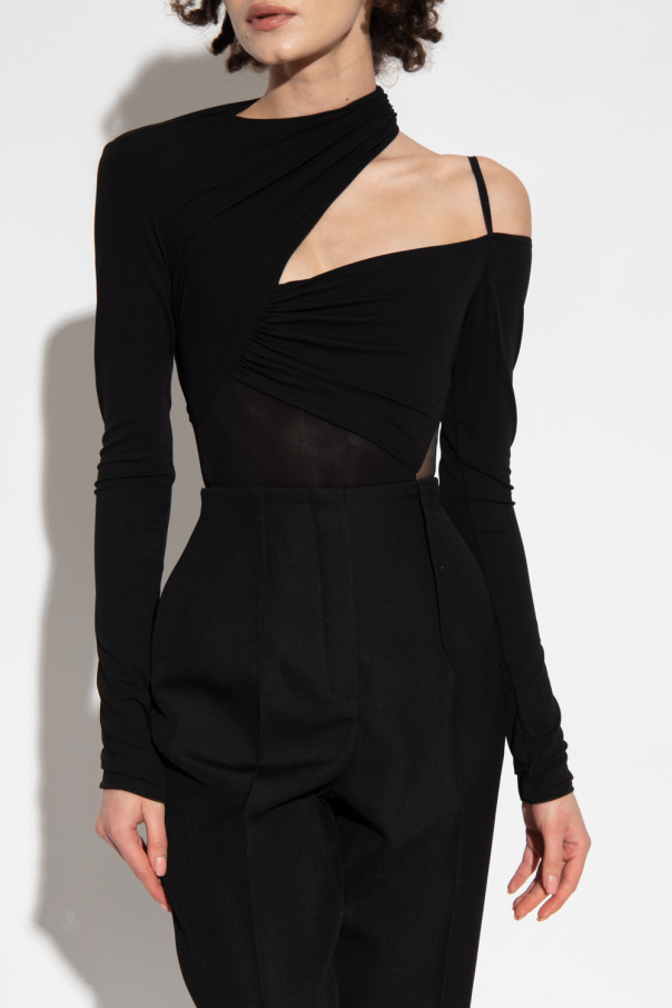 Black bodysuit from Nensi Dojaka. Distinguished by transparent inserts and draping on the front, this style features an asymmetrical neckline, a denuded shoulder, a thin strap, gathered details, cutouts and long sleeves with elasticated cuffs.