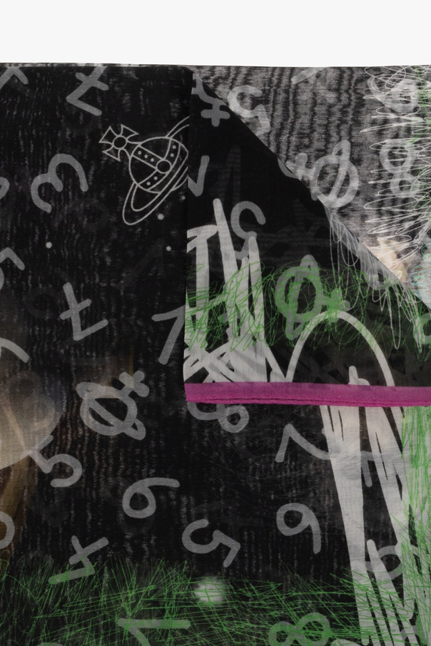 Black, sheer scarf from Vivienne Westwood. Made of a cotton and silk blend, this item is decorated with a logo pattern in white, green and pink.