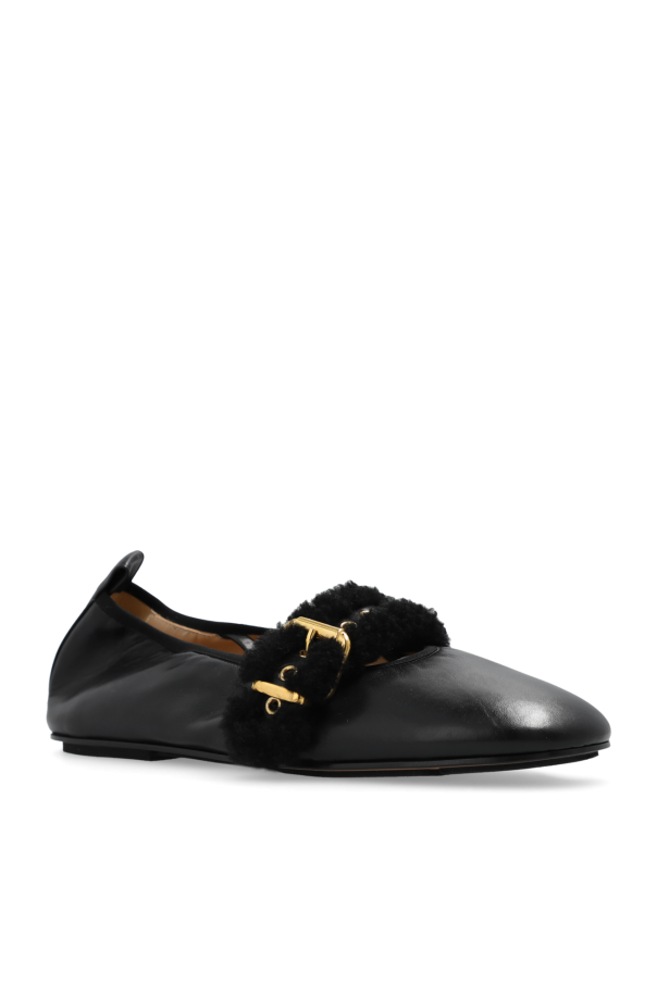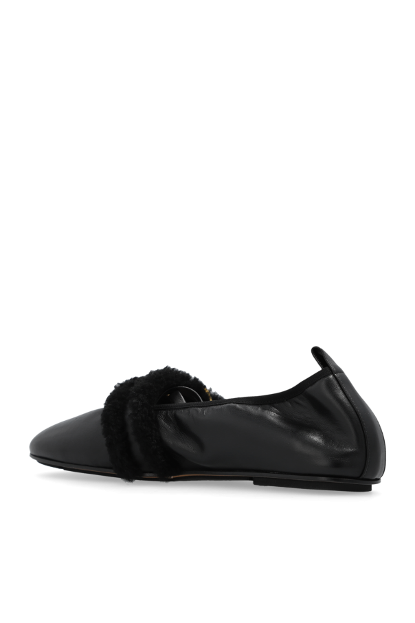 Black \'June\' ballet flats from Wandler. Made of lamb leather, this model sits on a black rubber sole with a beige leather trim and features an adjustable furry strap.