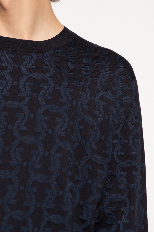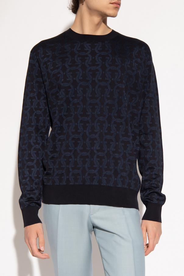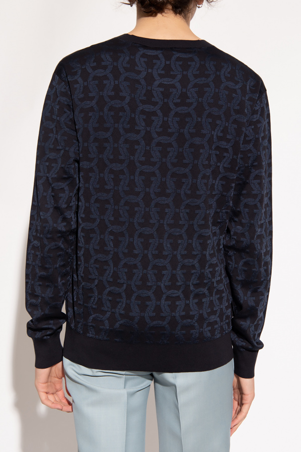 Black sweater from Salvatore Ferragamo. Crafted from a cotton and silk blend, this garment is enriched by a navy Gancini pattern and ribbed trims at the crew neck, hem and cuffs.