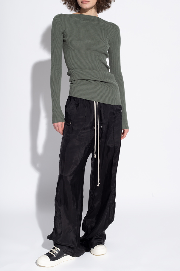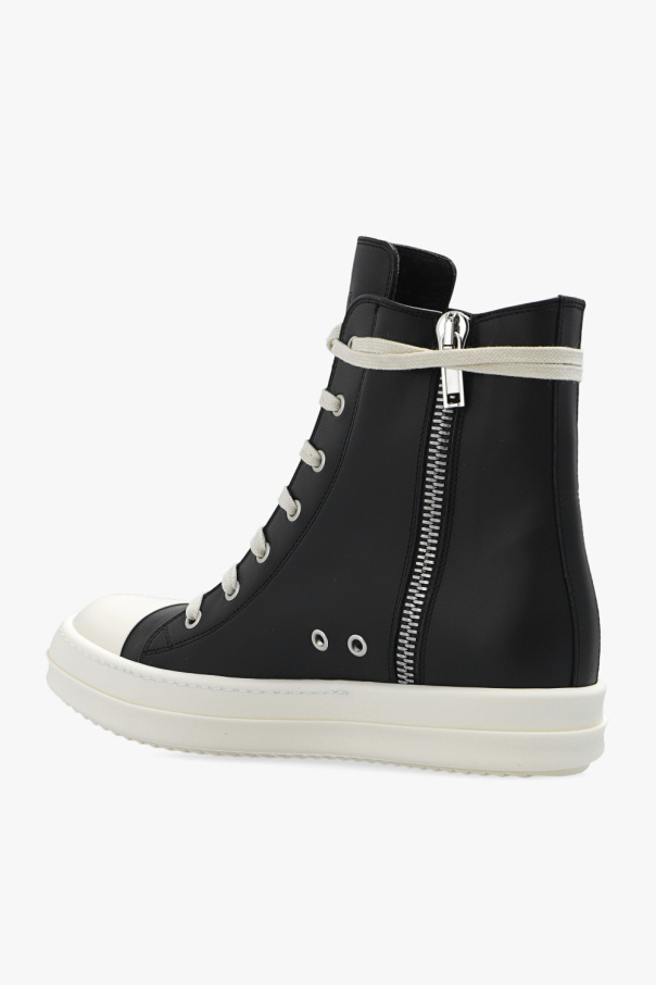 Black sneakers from Rick Owens. Crafted from leather, this model features a high-top silhouette, a side zipper and a cream rubber sole at the base.