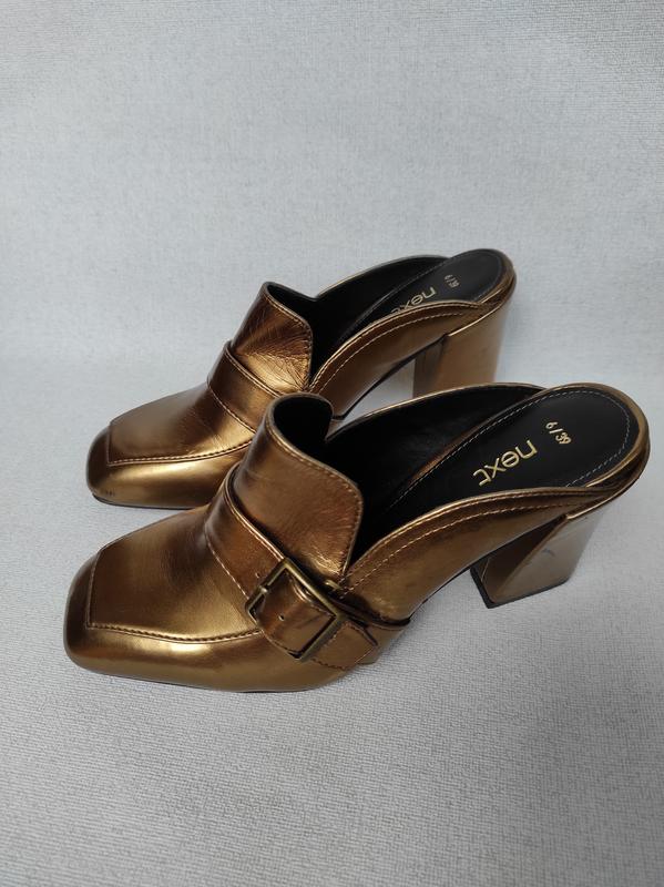 Шикарные туфли на широком каблуке без задников, с квадратным носком NEXT размер 39 . Очень удобные , кожа бронзового цвета с пряжками . подошва идеальна - по улице не носили , использовались на съёмках в студии , есть на каблуках некоторые следы (см на фото ) Все замеры - высота каблука , длина по стельке и полнота - видны на фото .