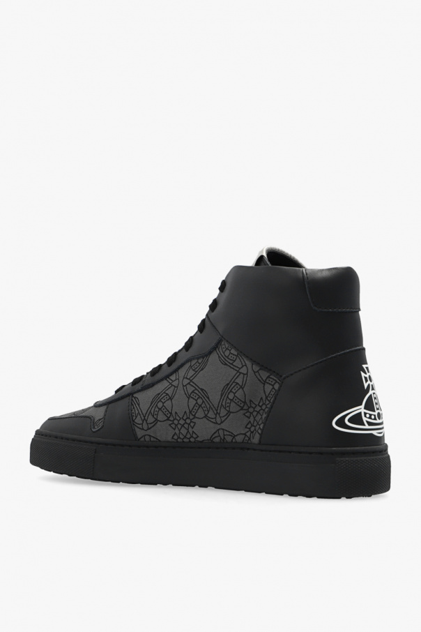 Black and grey high-top sneakers from Vivienne Westwood. Crafted from calf leather and recycled material, this lace-up model sits on a black rubber sole and showcases the brand\'s ‘Orborama’ pattern. It is complete with a white tongue patch and a printed white logo at the back.