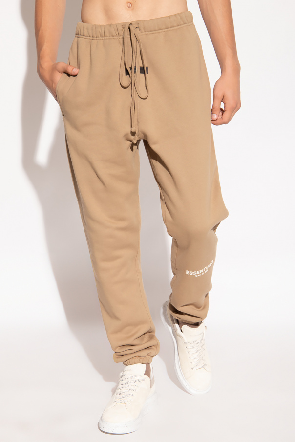 Beige sweatpants from Fear Of God Essentials. Fastened with drawstrings, this pair is complete with an elastic waistband, the brand’s signature rubber logo patch, cream logo print with a velvet finish, two slip pockets and ribbed cuffs.