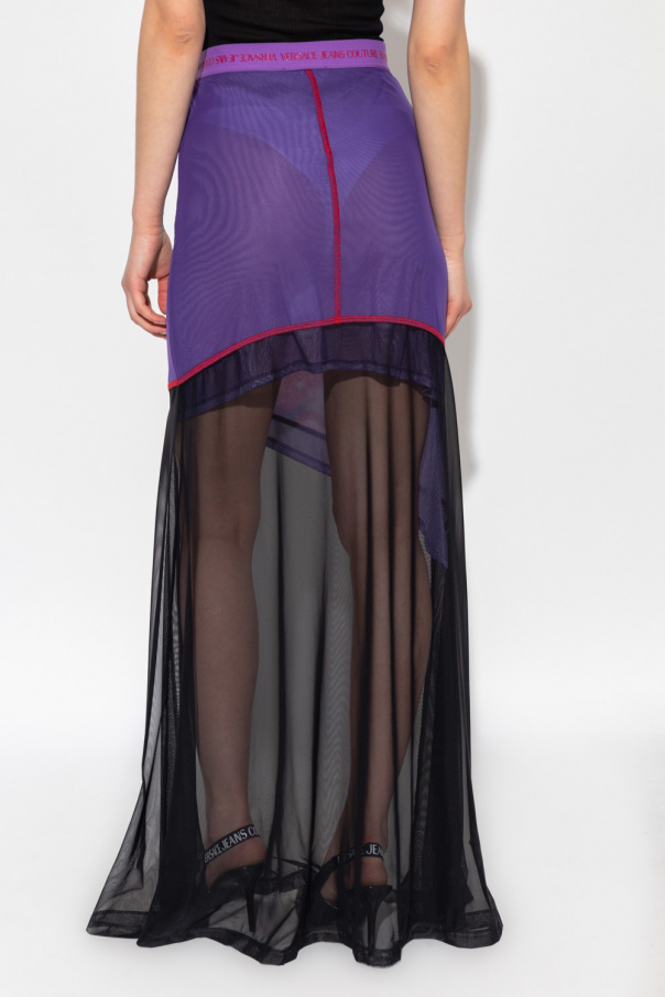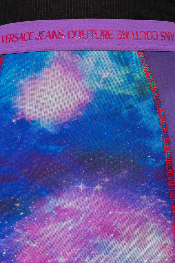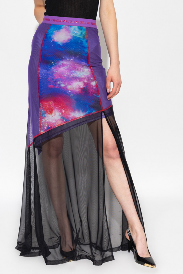 Purple skirt from Versace Jeans Couture. This design features an elastic waistband, a logo pattern, space motif and transparent insert at the hem.