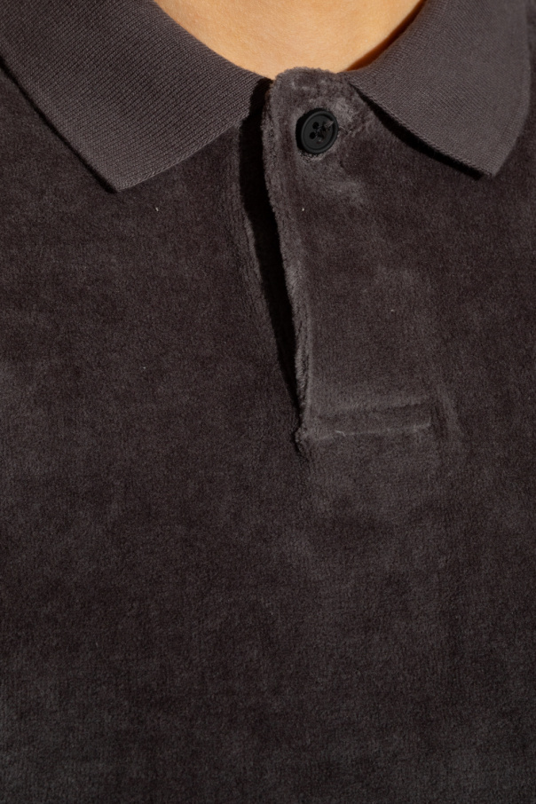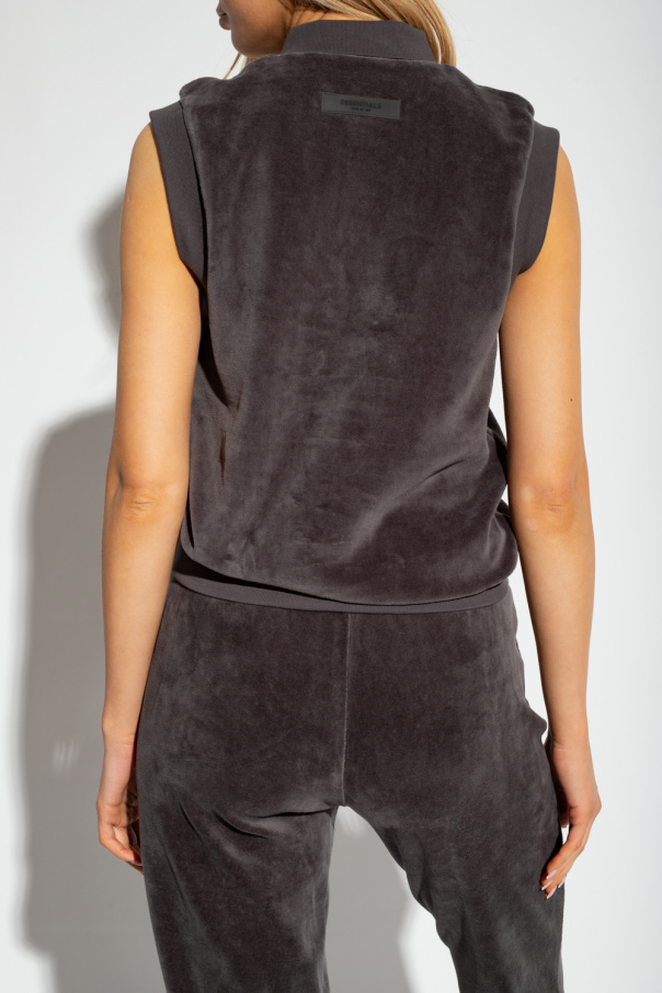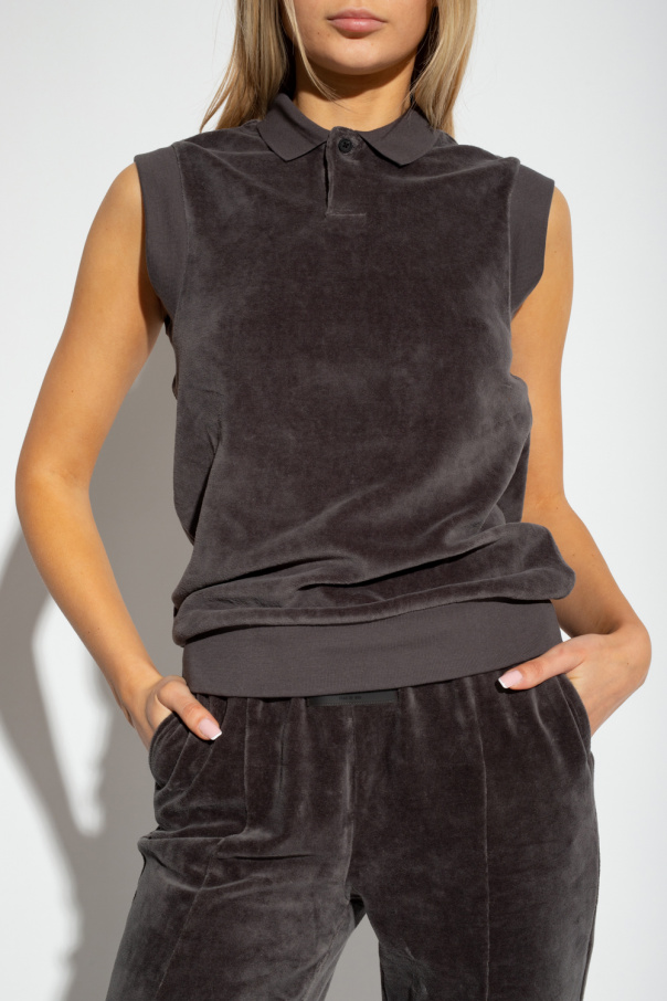 Dark grey sleeveless polo shirt from FEAR OF GOD ESSENTIALS. Rendered in velour, this style features a collar with a button placket and a rubber logo patch at the back.