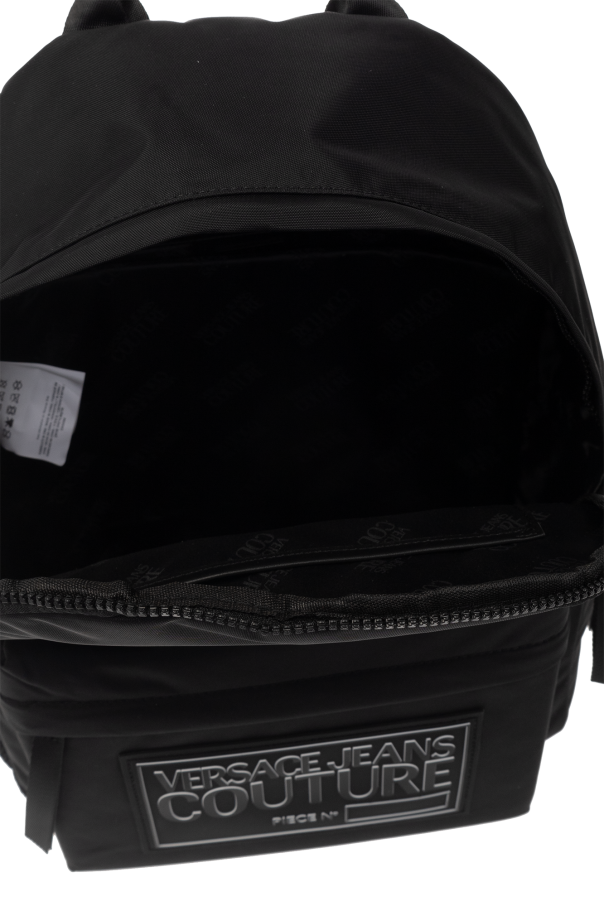 Black backpack from Versace Jeans Couture. Crafted from fabric, this design secures with a two-way zipper and showcases a rubber logo patch, multiple external pockets, one top handle, adjustable shoulder straps and one internal compartment with one zip pocket and two slip pockets.