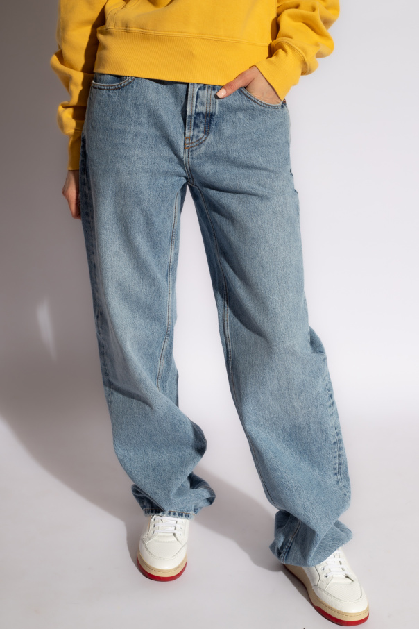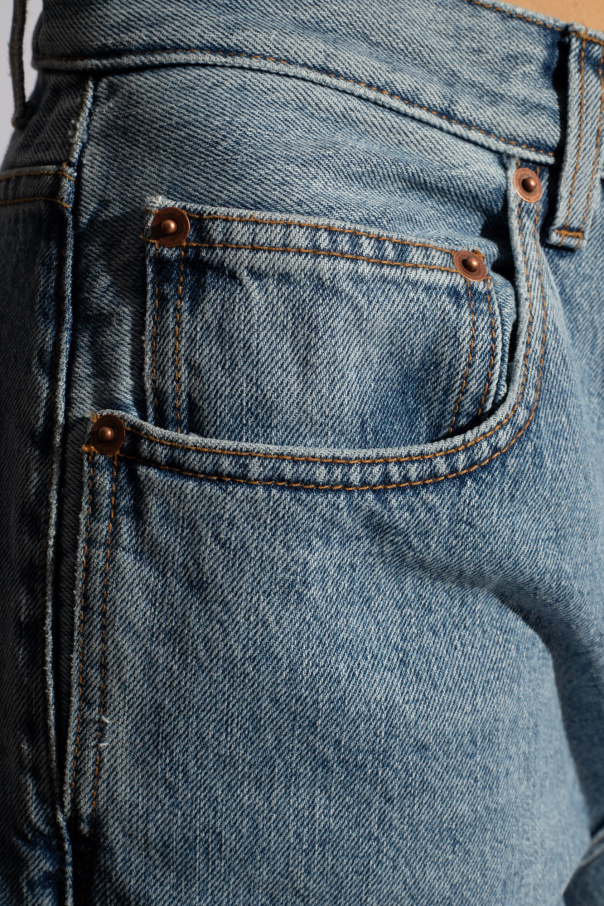 Blue high-rise jeans from Saint Laurent. Crafted with a vintage effect, this pair falls with straight legs and features button fastenings, classic five-slip pockets and a leather logo patch on the back.