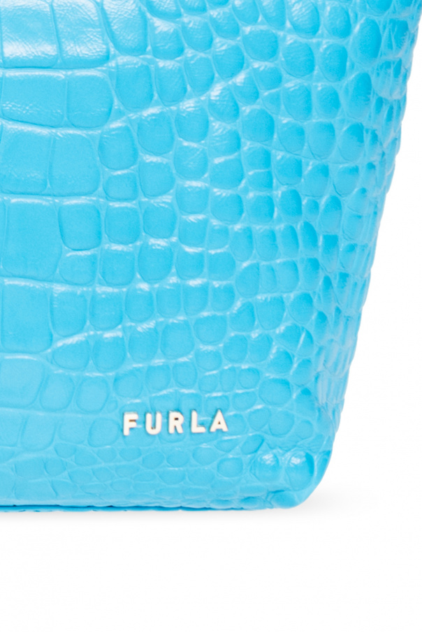 Blue ‘Ginger Small’ hobo bag from Furla. Made of leather with a crocodile skin effect, this model features a two-way zip with decorative logo charms, metal logo, half-round handle, gold-tone metal hardware and one internal compartment with black lining and two slip pockets.