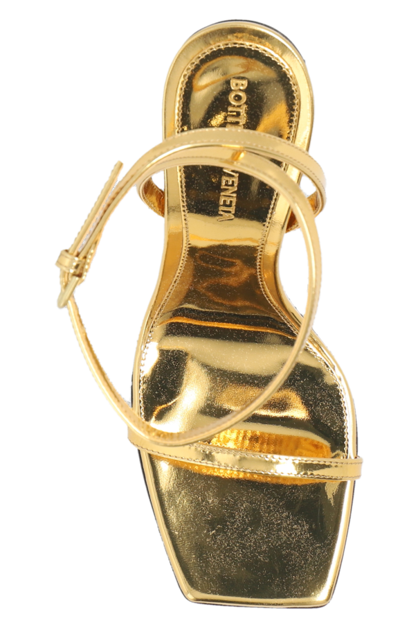 Gold-tone ‘Knot’ heeled sandals from Bottega Veneta. Made of leather with an open square toe, this model sits on a beige leather sole with anti-skidding inserts and features a buckle strap around the ankle and a distinctive, gold-tone heel.
