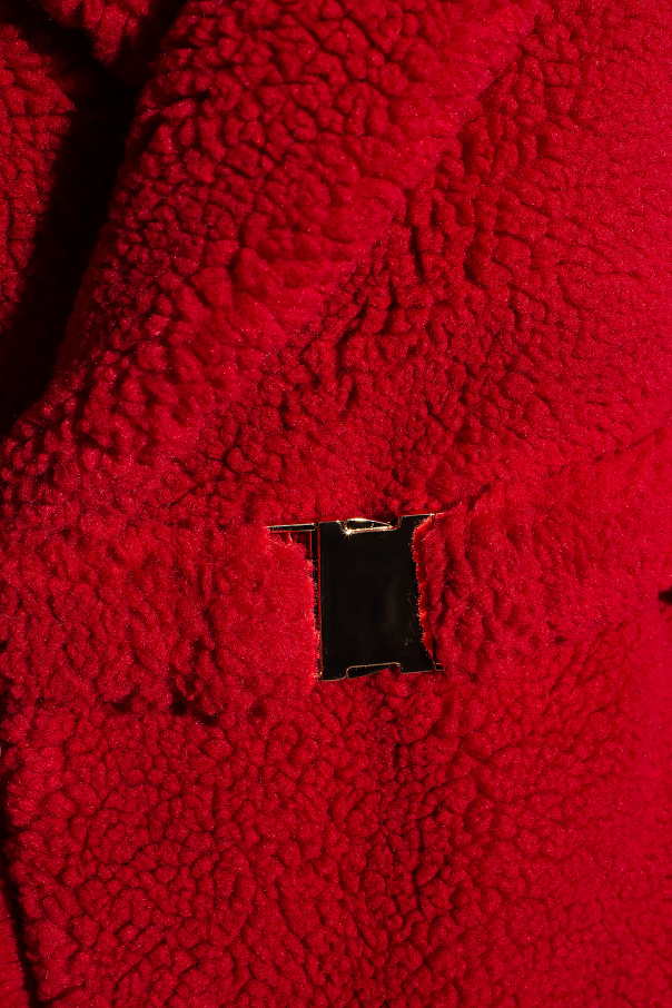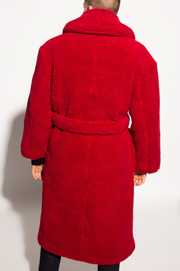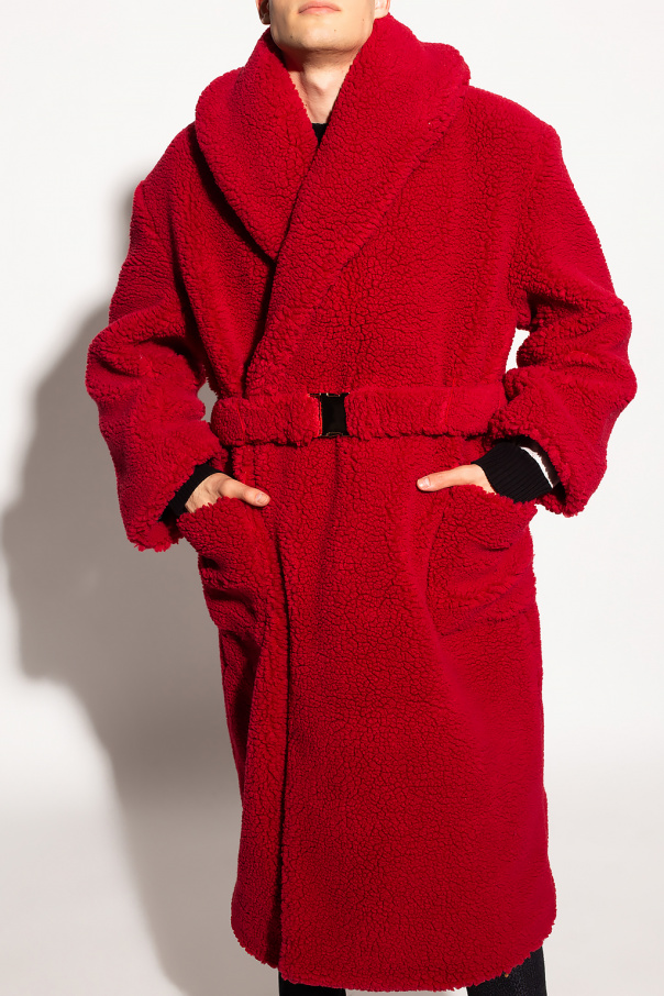Red coat from Casablanca. Made from recycled faux fur, this garment is complete with a belt with a gold-tone buckle as well as two front pockets.