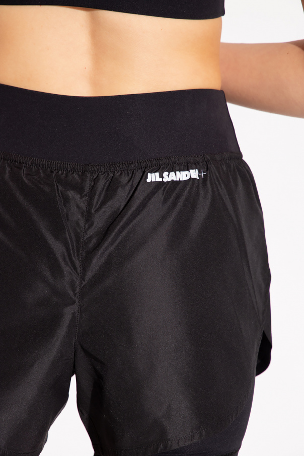 Black two-layered training shorts from Jil Sander+. This pair is complete with an elastic waistband and white logo print.