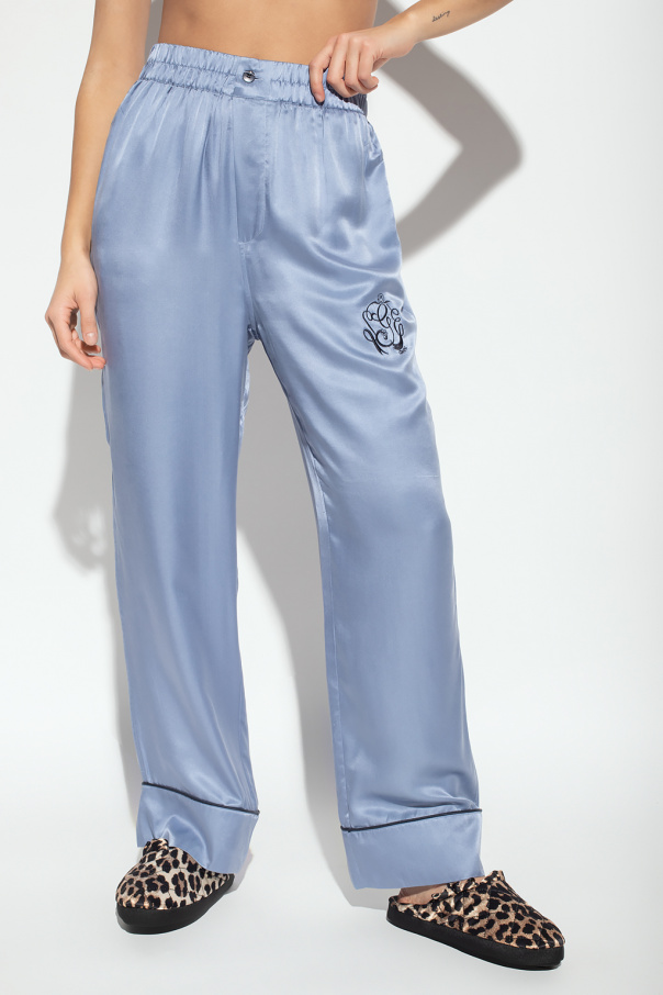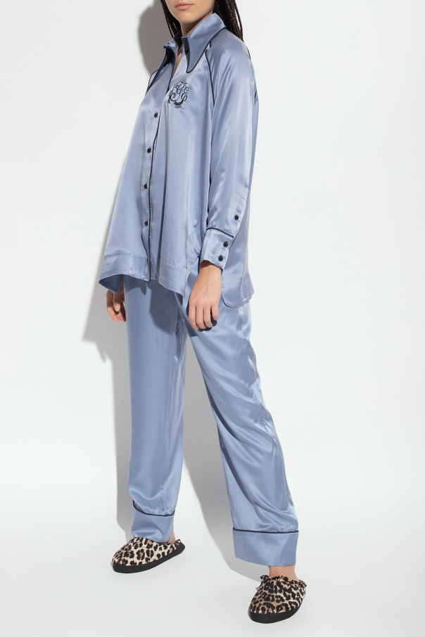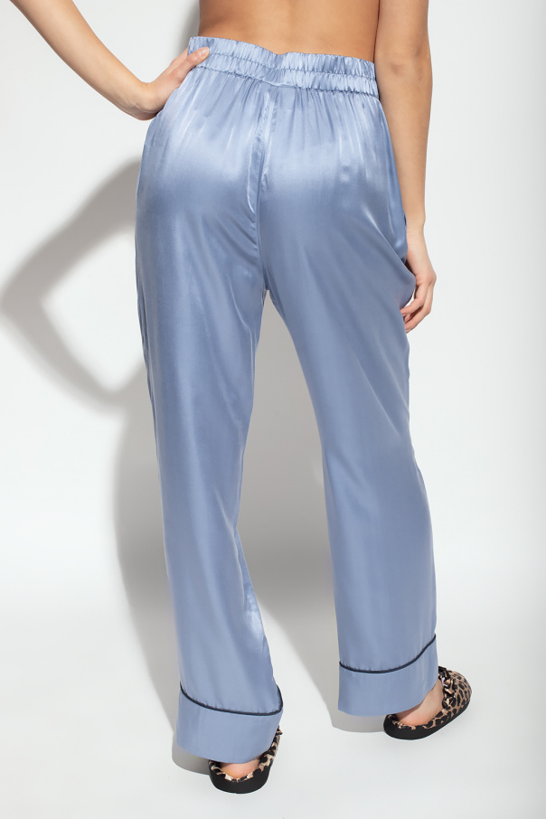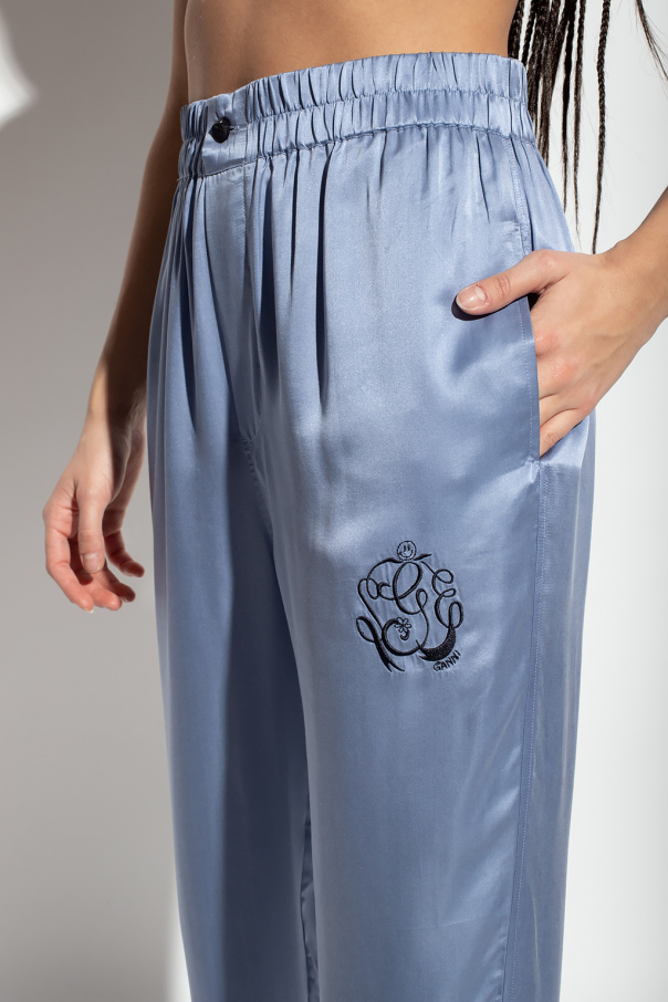 Blue pyjama bottoms from Ganni. Fastened with a button, this garment features an elastic waistband, embroidered logo pattern in black, two slip pockets and straight legs with turn-up cuffs.