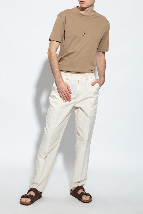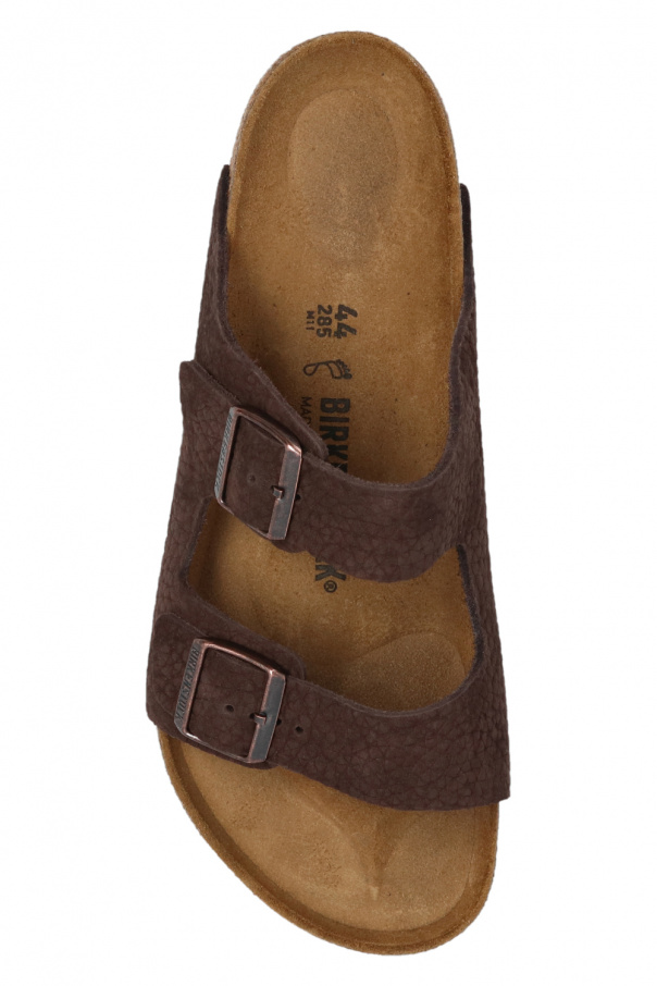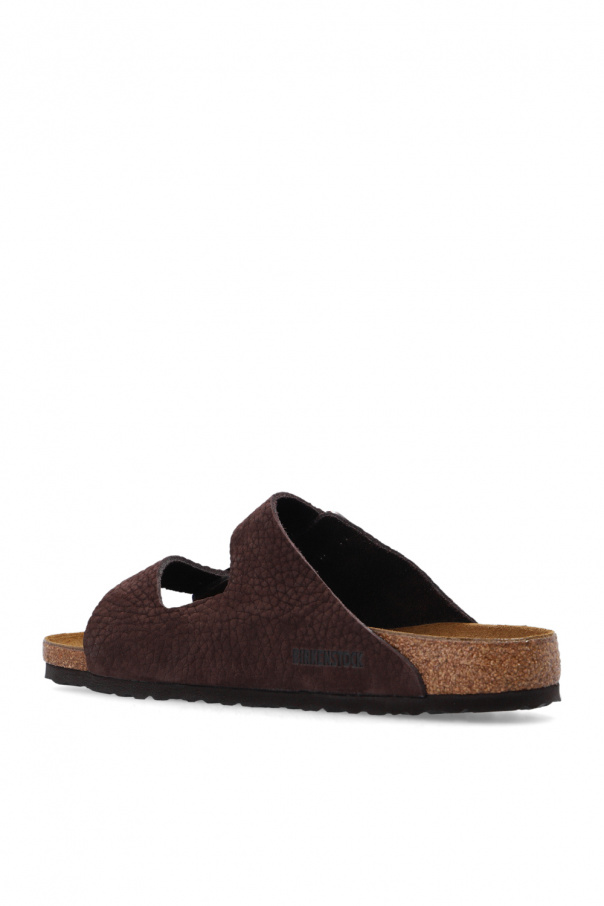 Brown ‘Arizona BS’ slides from Birkenstock. Made of nubuck, this model features straps with logo-embossed buckles in a rusty copper colour and a brown sole in natural cork and EVA.