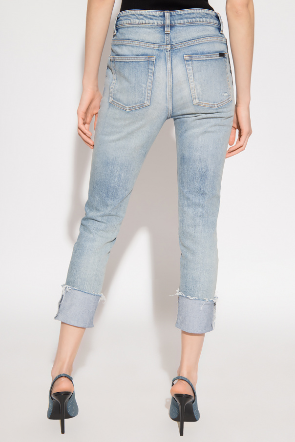Blue jeans with a vintage effect from Saint Laurent. Fastened with a zip and button, this pair features three front pockets, two back pockets with a logo patch and slightly tapered legs.