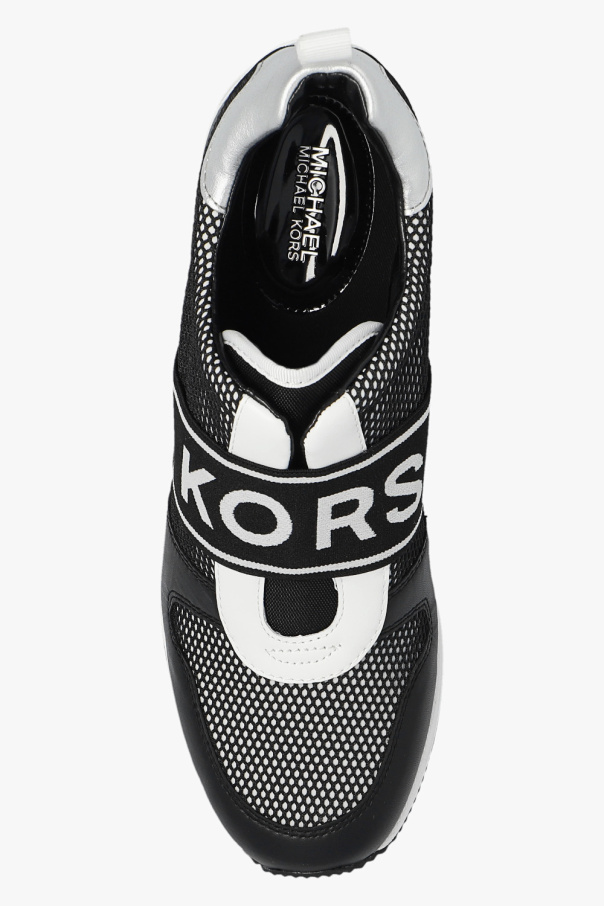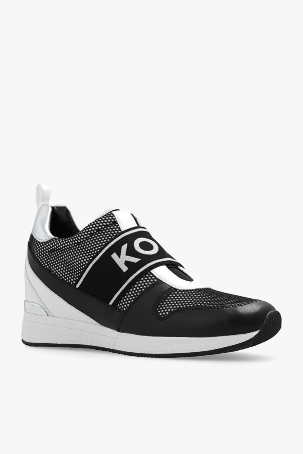 Black and white ‘Maven’ wedge sneakers from Michael Michael Kors. Crafted from leather and mesh, this model features a slip-on silhouette, a logo-embroidered elastic band on the front, a silver-tone heel counter and a black and white rubber sole.
