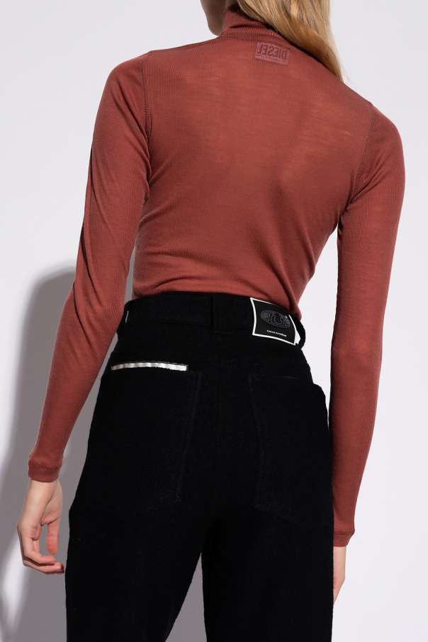 Brown turtleneck sweater from Diesel. Crafted from a wool blend with a ribbed texture, this style features long sleeves and a distinctive silver-tone chain necklace accentuated with black glass stones.