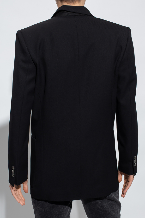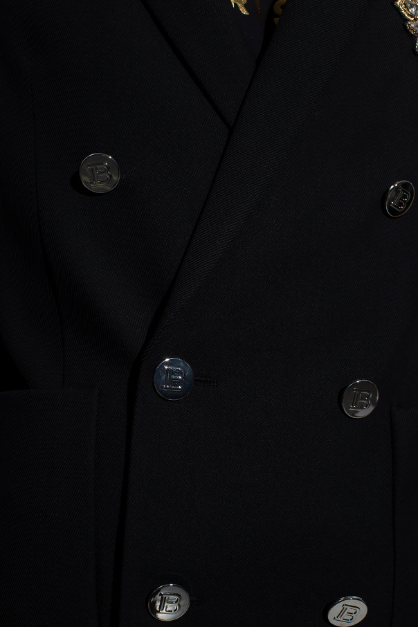 Black blazer from Balmain. Made of wool with a double-breasted silhouette, this style features button fastenings, a patch with a sparkling appliqué, peak lapels, two slip pockets, long sleeves, padded shoulders and a single back vent.