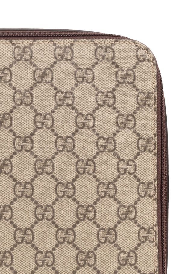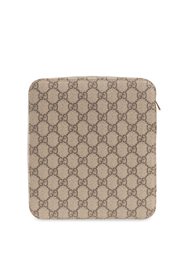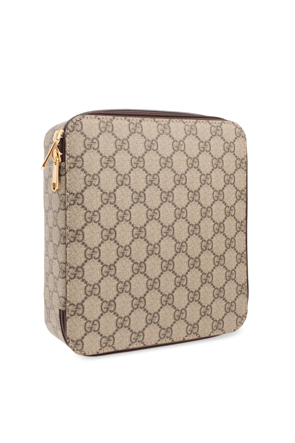 Beige and brown travel case from Gucci. Made of monogrammed ‘GG Supreme’ canvas, this item features a two-way zip fastening, gold-tone metal hardware and one internal compartment.