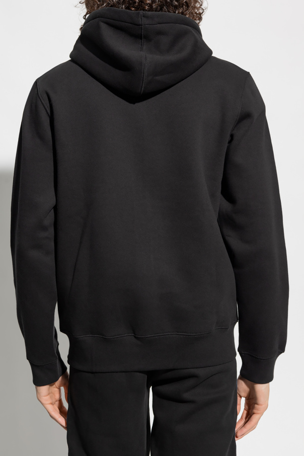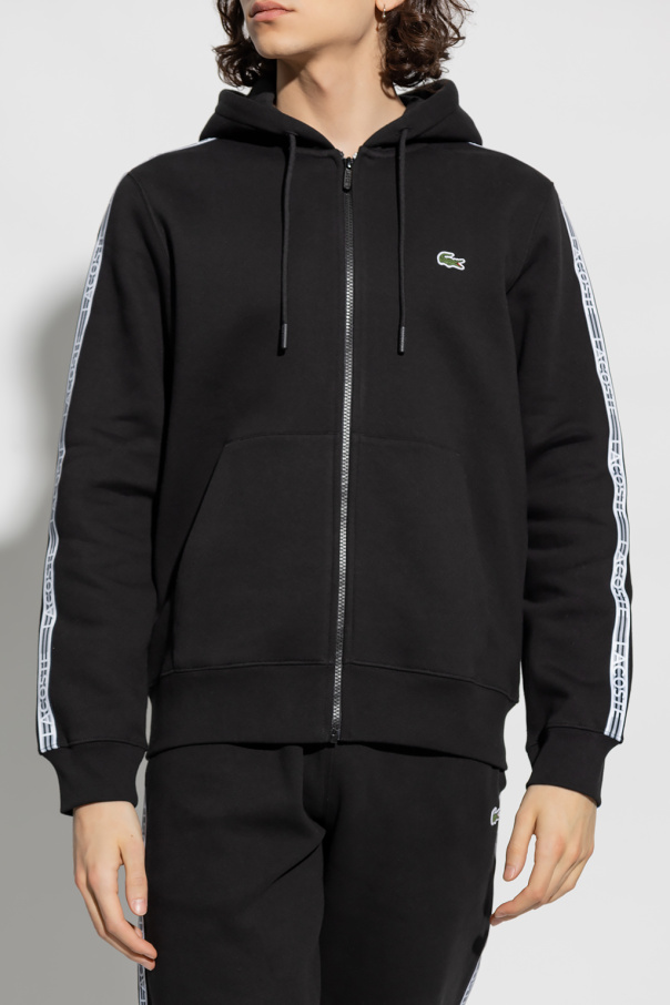 Black hoodie from Lacoste. Made of cotton. Fastened with a zip, this garment feature a drawstring hood, green logo patch, white, grey and black branded stripes down the sleeves, two slip pockets and ribbed edges.