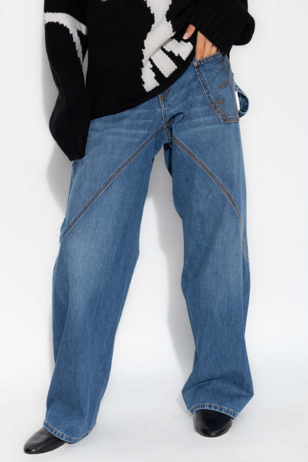 Dark blue jeans from J.W. Anderson. Fastened with an asymmetric zip and button fastening, this loose-fitting design features a low crotch, twisted seams, leather logo-embossed patch in brown, three slip pockets and the brand’s signature anchor motif.