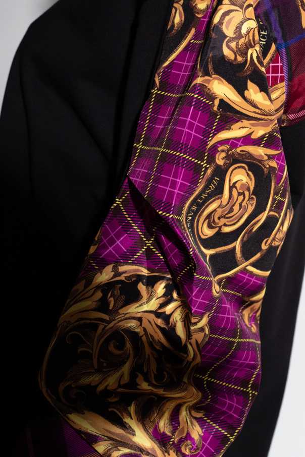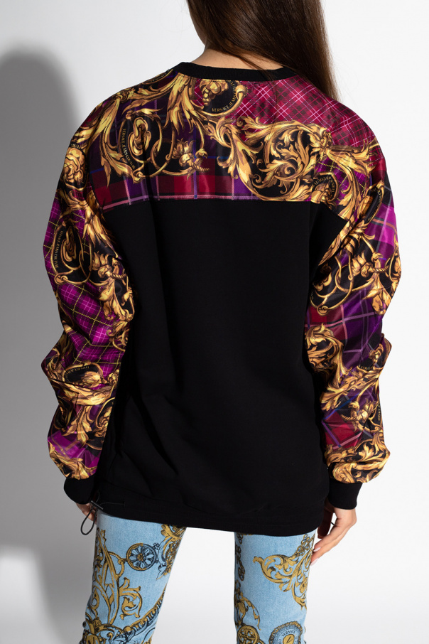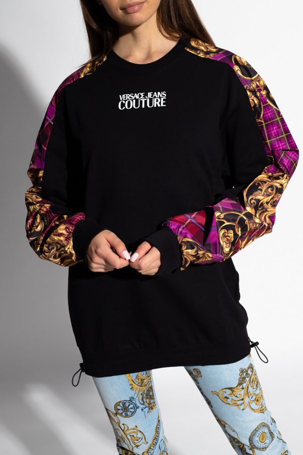 Black crewneck sweatshirt from Versace Jeans Couture. Crafted from cotton jersey, this style showcases colourful panelling, long sleeves with elasticated cuffs, a drawcord-adjustable hem and a colourful graphic print with the brand's logo and the iconic Barocco motif.