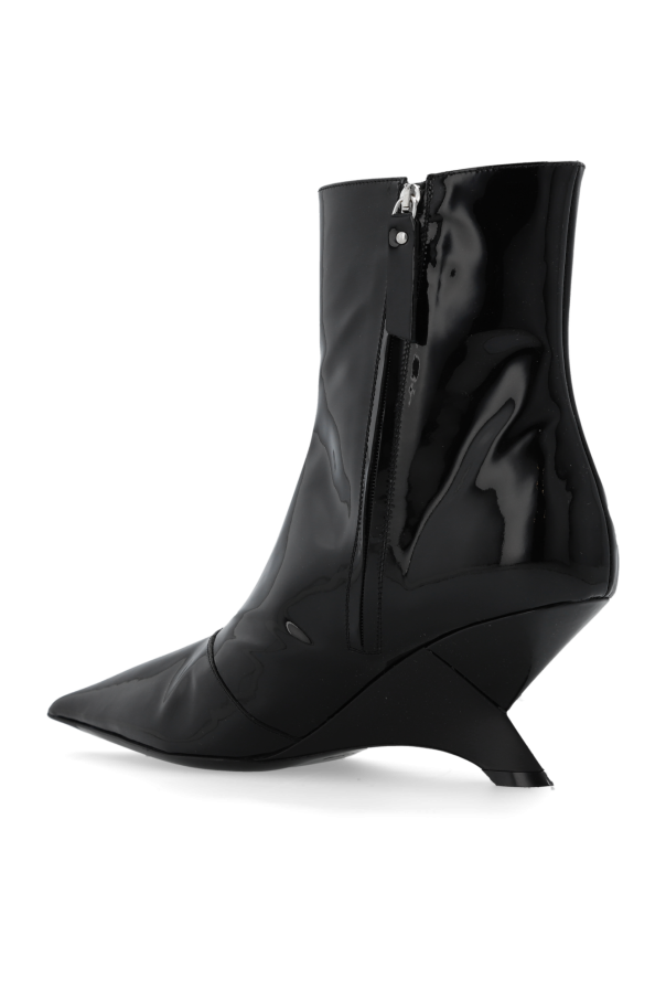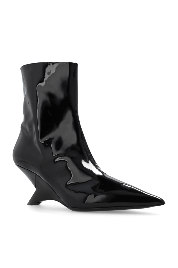 Black ‘Swam’ heeled ankle boots from Vic Matie. Crafted from patent leather, this pair features a side zip, pointed toe, decorative heel and black leather sole.