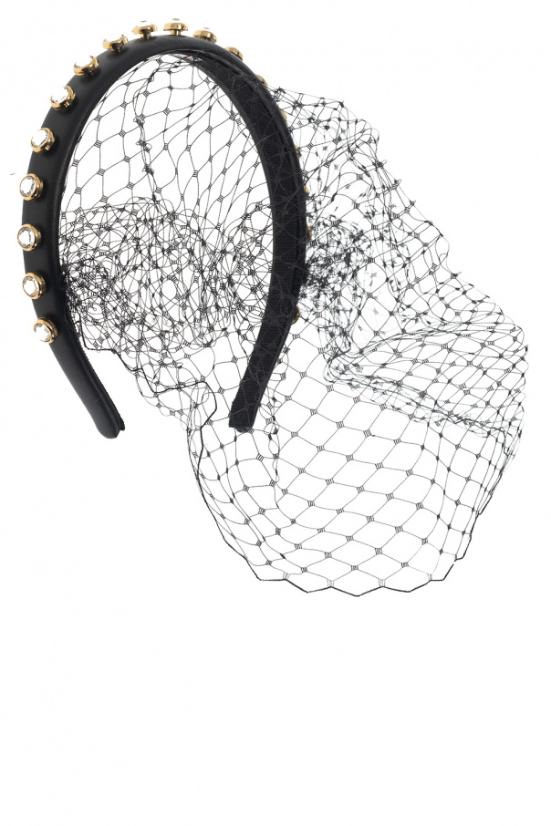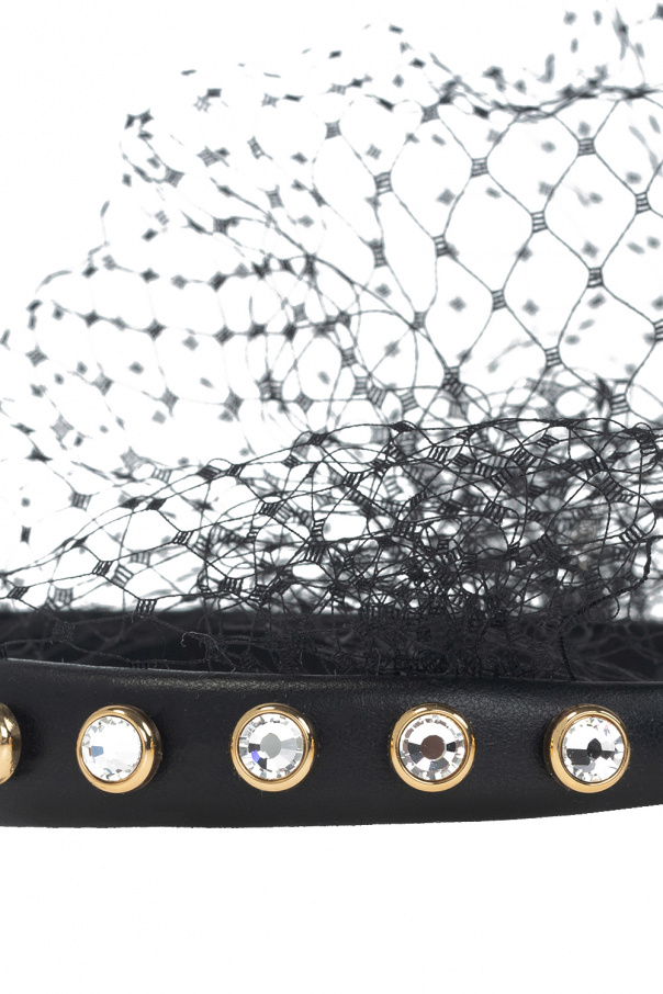 Black headband from Red Valentino. Made of leather, this model features white and gold-tone appliqués and a sheer veil in black.