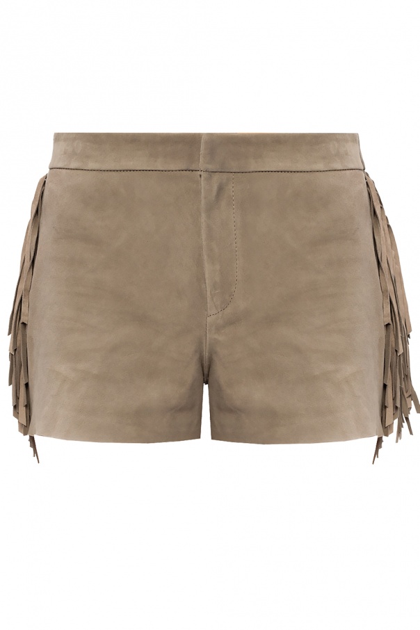 Grey ‘Calix’ shorts from AllSaints. With flattering slim leg, this suede-crafted pair has zip and hook fastenings and distinctive tassel details to the sides.