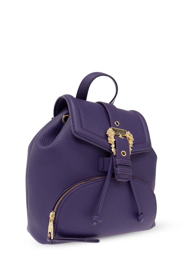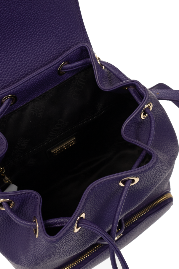 Purple backpack from Versace Jeans Couture. Crafted from faux leather, this design cinches closed with drawstrings, fastens with a magnetic snap and showcases a decorative strap with a logo-embossed buckle. It is complete with a half-round handle, one zip pocket on the front, adjustable shoulder straps, gold-tone metal hardware and one internal compartment with one zip pocket and two slip pockets.