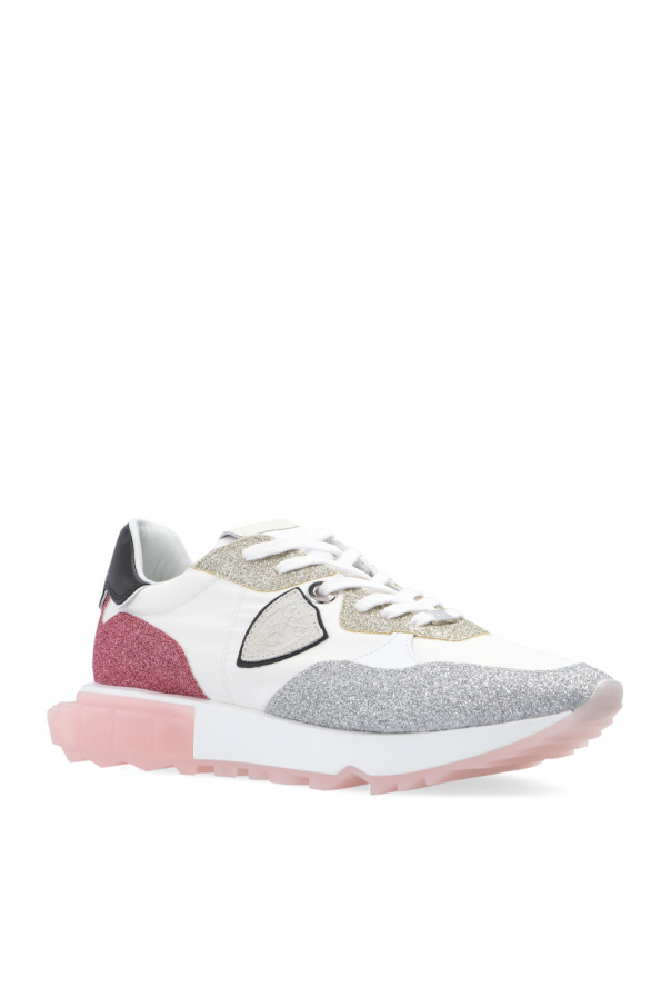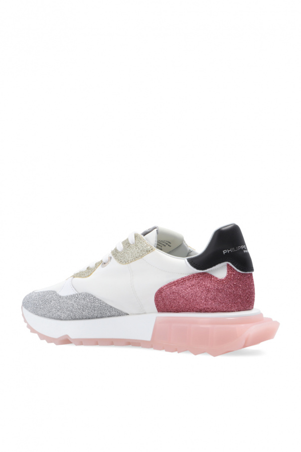 Multicolored ‘La Rue’ sneakers from Philippe Model. Resting on a light pink and white rubber sole, this lace-up pair is embellished by a gold-tone, silver-tone and red glitter, black leather heel counter printed with a logo and rubber sole in light pink and white.