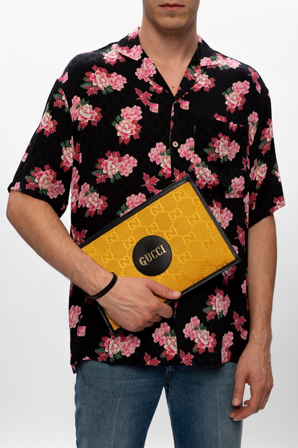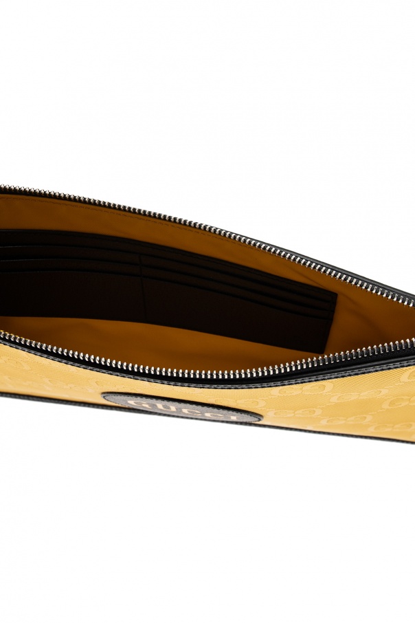 Yellow and black pouch from Gucci. Crafted from logo-embroidered eco nylon with leather trims, this item features a zip fastening, embossed logo in gold-tone, removable wrist strap, antiqued silver-tone metal hardware and one internal compartment with one slip pocket and six card slots.