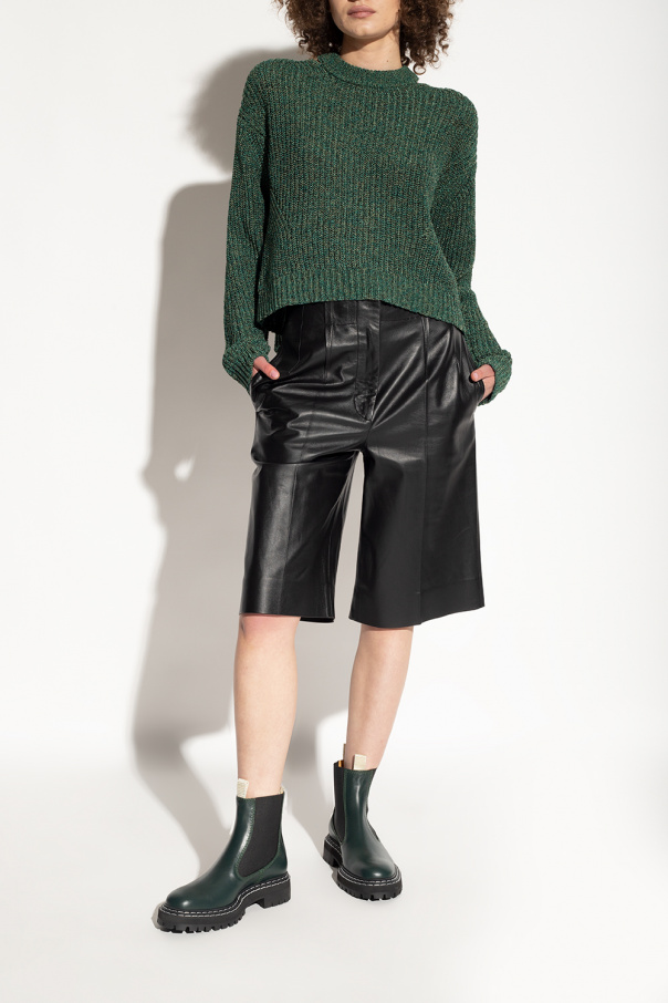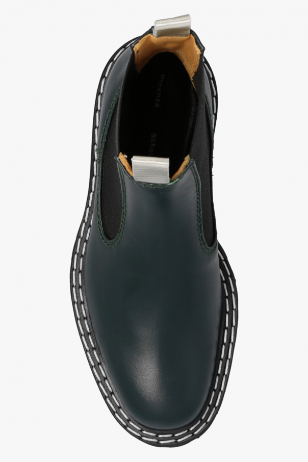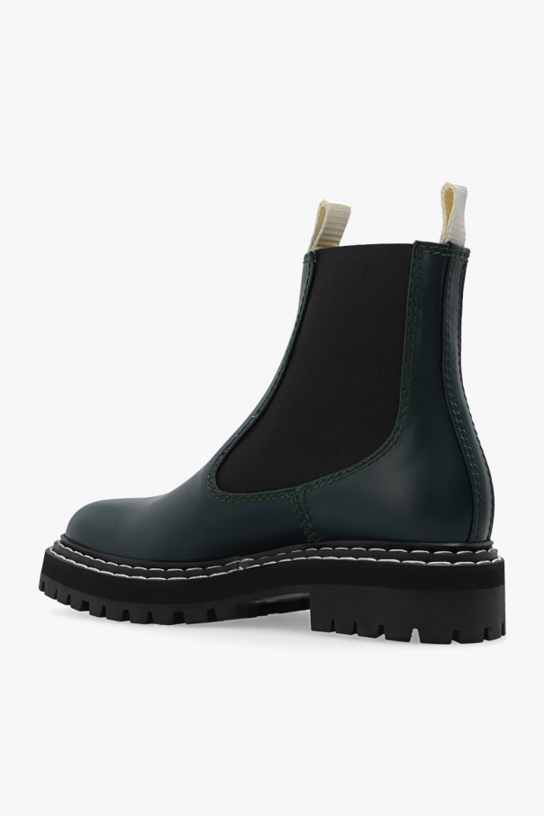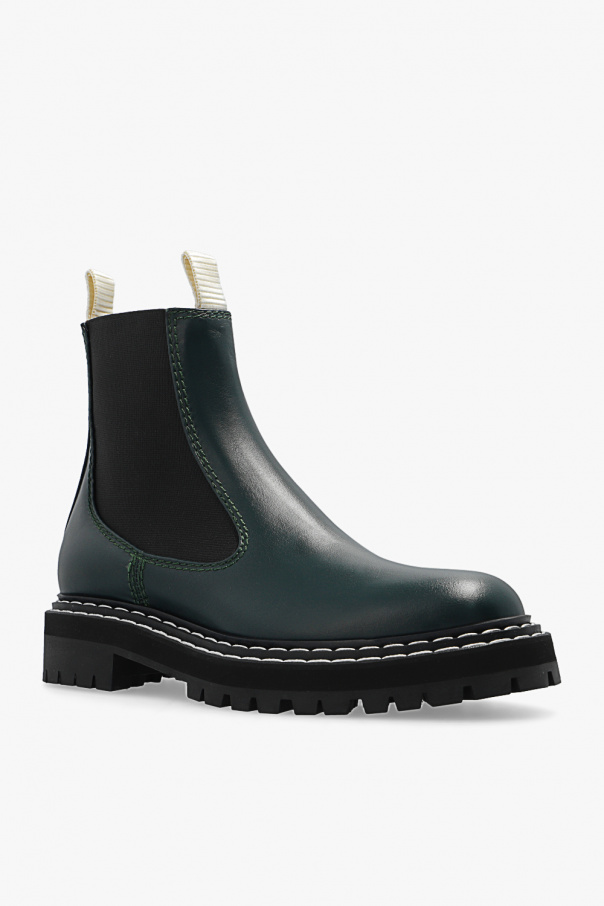 Dark green Chelsea boots from Proenza Schouler. Made from calf leather, this model features black elastic panels on the sides and a black rubber sole accentuated with contrasting white stitching details.