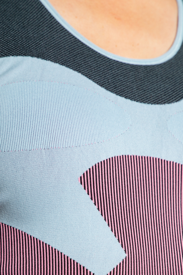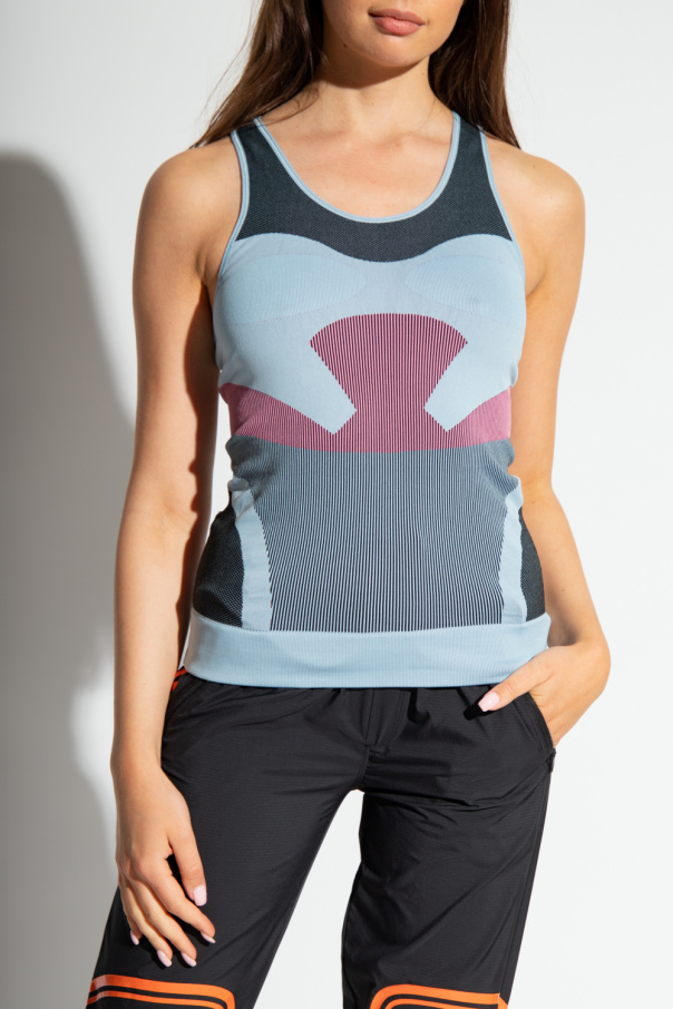 Blue, pink and black training tank top from ADIDAS by Stella McCartney. Distinguished by a rib-knit pattern, this style features a round neck and an elasticized bottom hem.
