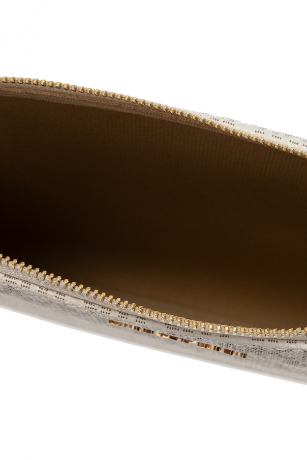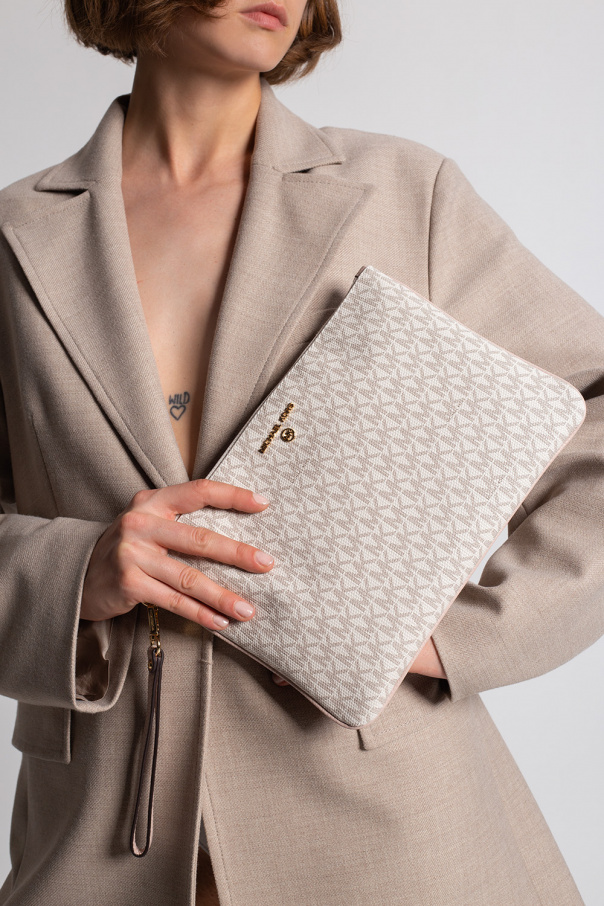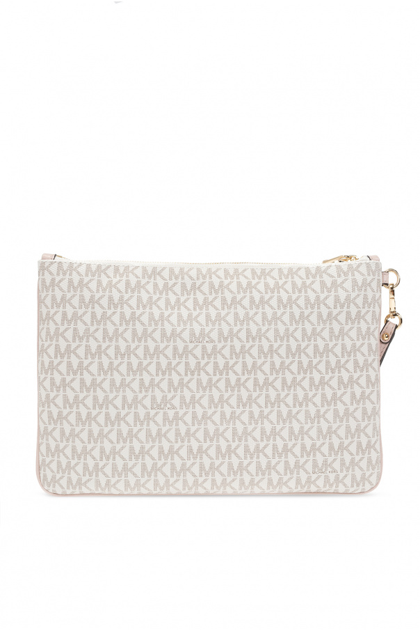 Cream, brown and pink hand bag from Michael Michael Kors. Fastened with a zip, this design features an appliqué, ‘MK’ monogram pattern, wrist strap, one internal compartment and gold-tone metal hardware.