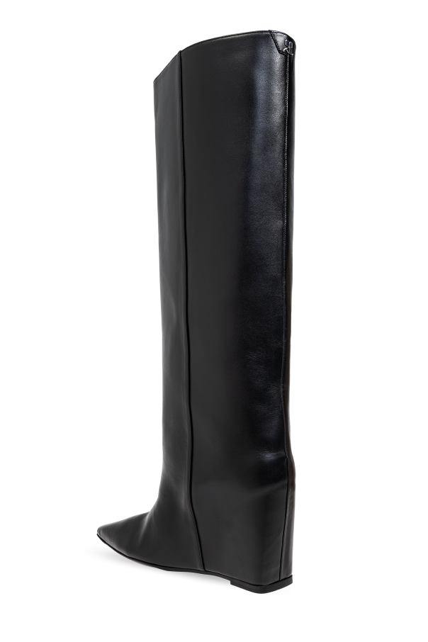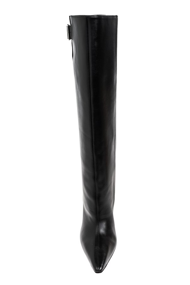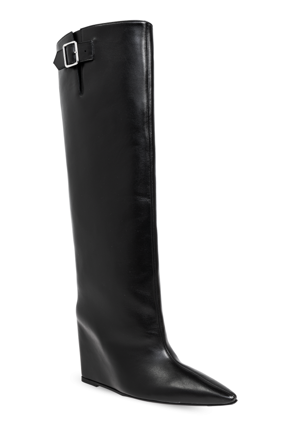 Introducing the Courrèges Leather Boots, a masterpiece of modern elegance and timeless sophistication. These exclusive black boots, made from the finest quality leather, epitomize luxury and durability. The classic knee-high design with a pointed toe creates an aura of refined style, while the smooth, unadorned surface emphasizes a minimalist and contemporary aesthetic. The boots feature a concealed wedge heel, providing additional support and comfort, discreetly enhancing your height without compromising on ease of wear. The top of the shaft is adorned with a metal buckle, which serves not only as a functional closure but also as a stylish decorative element, adding a touch of elegance and contrast to the sleek black leather. Why Choose This Product? High-Quality Materials: Crafted from premium leather inside and out, ensuring longevity and a luxurious feel. Elegant Design: The knee-high silhouette and pointed toe create a sophisticated look suitable for various occasions. Comfort and Style: Hidden wedge heel for added height and comfort. Adjustable Fit: Functional metal buckle for a customizable fit around the calf. Versatile Use: Perfect for both formal events and everyday wear.