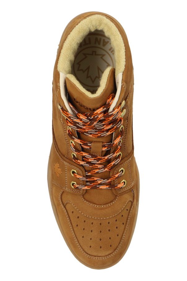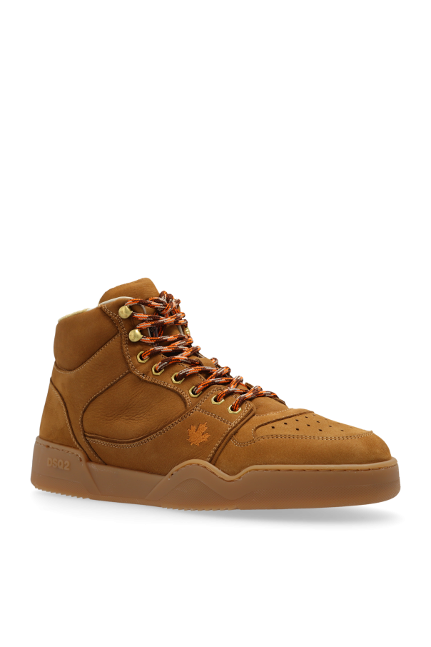 Buty sportowe za kostkę ‘Spiker’ Introducing the ‘Spiker’ High-Top Sneakers from the illustrious Dsquared2 collection. These exquisite ankle boots epitomize the perfect amalgamation of sporty elegance and unparalleled comfort, crafted meticulously for the discerning gentleman. Designed with a high-top silhouette, these sneakers offer enhanced ankle support, enveloped in luxurious suede leather. The rich brown hue, complemented by striking orange-brown laces, exudes a sophisticated charm. The interior is lined with a soft, plush material, ensuring supreme comfort with every step. Distinguished details include a subtle leaf logo on the side, the inscription \"DSQ2\" on the rubber sole, and the embossed number \"1995\" on the heel. The metal eyelets and perforated toe box not only add a touch of rugged elegance but also enhance durability and breathability. Why Choose This Product? High-Quality Materials: Premium suede leather exterior, plush interior lining, and durable rubber sole. Unique Design: Contrasting laces, embossed details, and iconic brand markings. Ultimate Comfort: Enhanced ankle support and breathable perforations. Versatile Style: Perfect blend of sporty and elegant, suitable for various occasions.