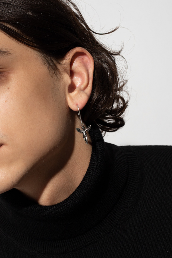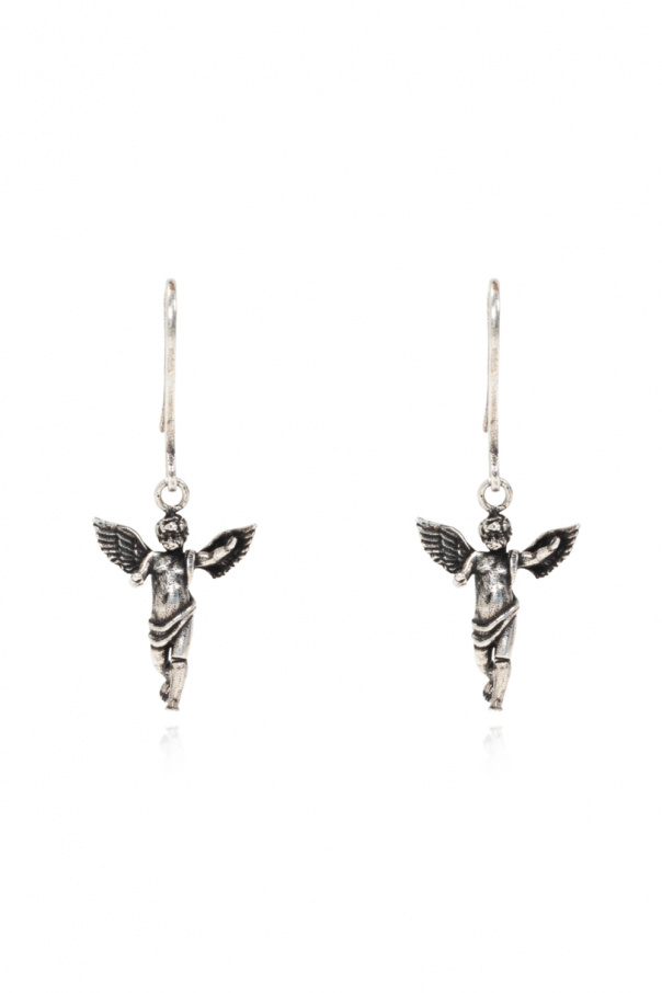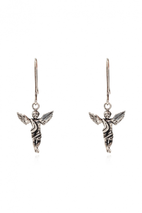 Antiqued silver-tone earrings from Saint Laurent. Made of brass, they showcase a logo-embossed angel pendant.