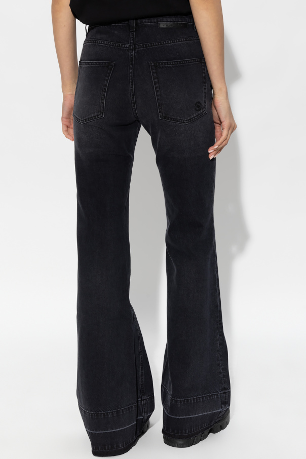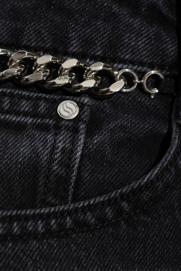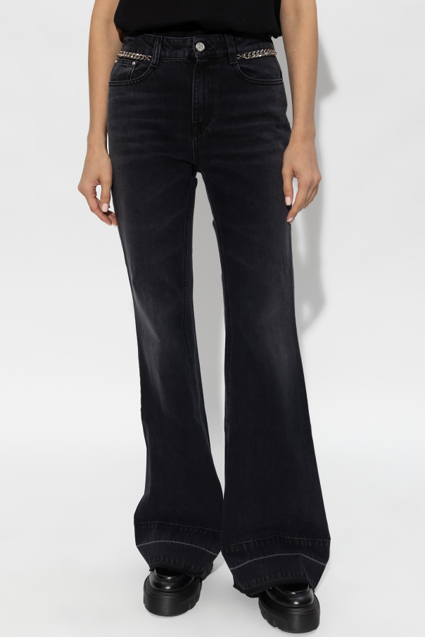 Black jeans from Stella McCartney. Falling with flared legs, this pair features a zip fly with a button, classic five pockets, distressed detailing, detachable gold-tone chains on the front and a logo label at the back.