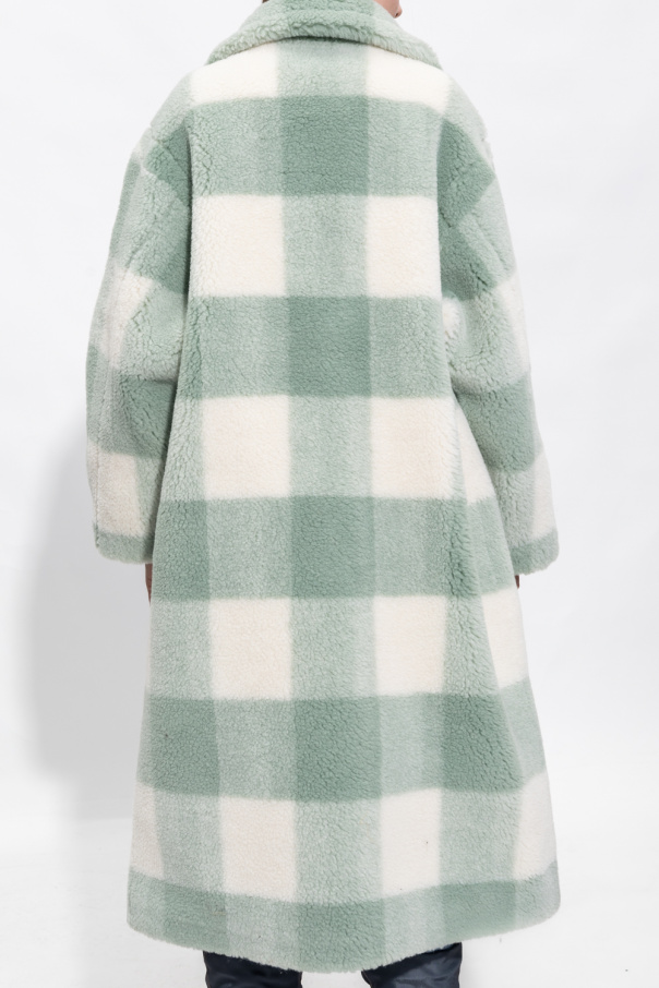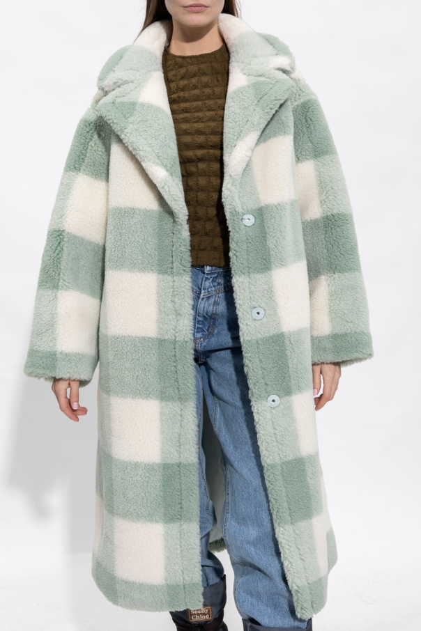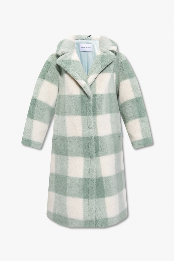Green and white ‘Maria’ coat from Stand Studio. Crafted from wool blend faux fur, this design features snap fastenings, check pattern, two front pockets and long sleeves.