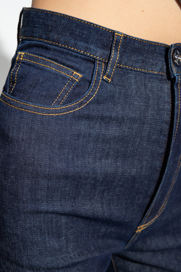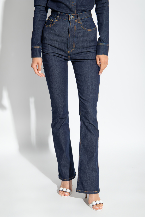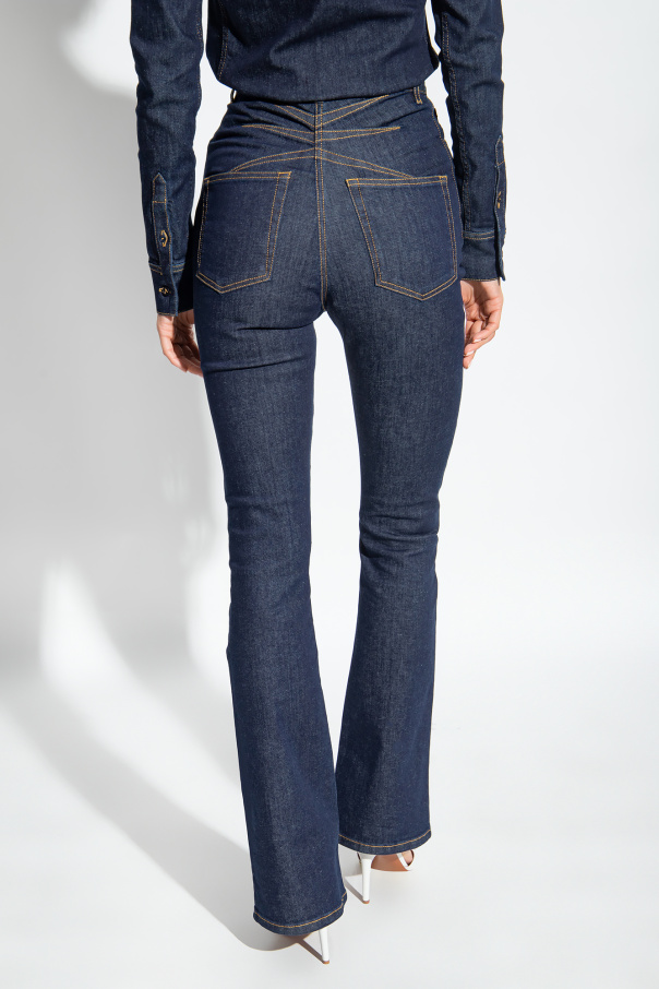 Navy high-waisted bootcut jeans from Alaia. Fastened with a zip and button, this pair features contrasting stitching details in yellow and five slip pockets.