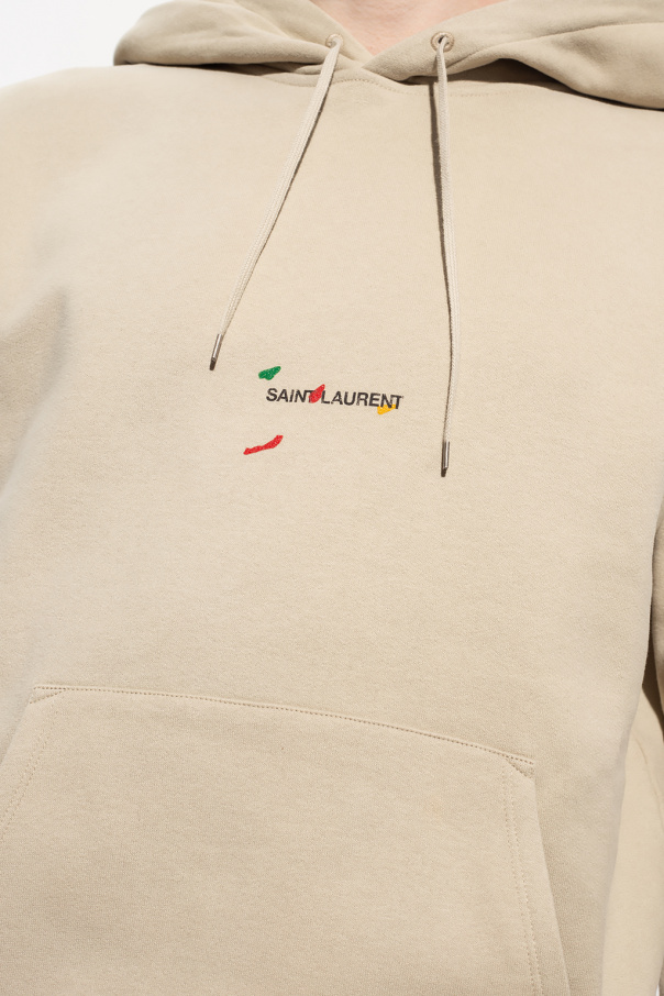Beige hoodie from Saint Laurent. Made of cotton, this garment features a drawstring hood, black logo print, paint splatter effect in green, red and yellow, slip pocket and ribbed trims at the hem and cuffs. © BRUNO V. ROELS COURTESY OF GALLERY FIFTY ONE