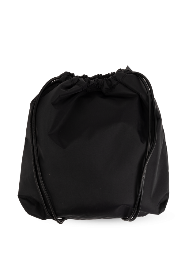 Black backpack from Y-3 Yohji Yamamoto. Made from fabric and trimmed with leather, this design fastens via a magnetic snap and showcases a frontal pocket with a printed black logo, one half-round handle, drawstring sides and one internal compartment with a zip pocket.