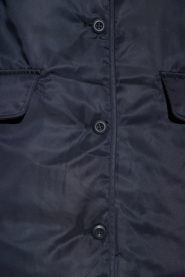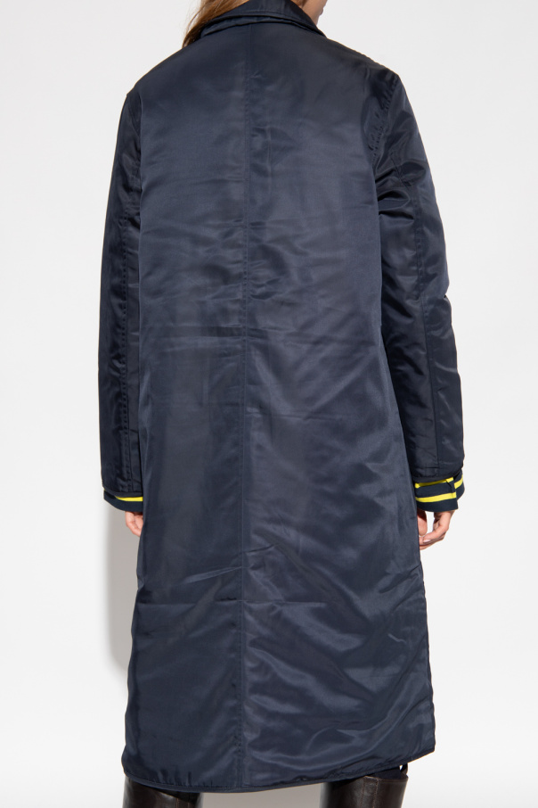 Navy ‘Vada’ insulated coat from Samsoe Samsoe. Crafted from recycled fabric, this design features button fastenings, two flap pockets and trimming at the hem and cuffs.
