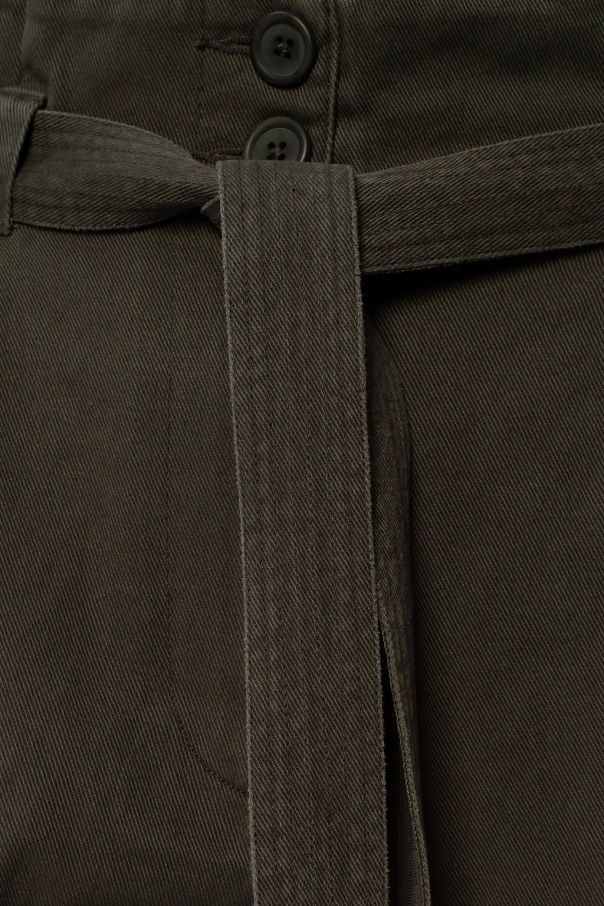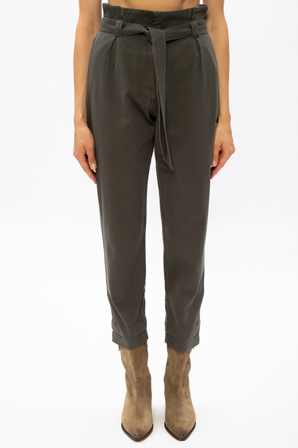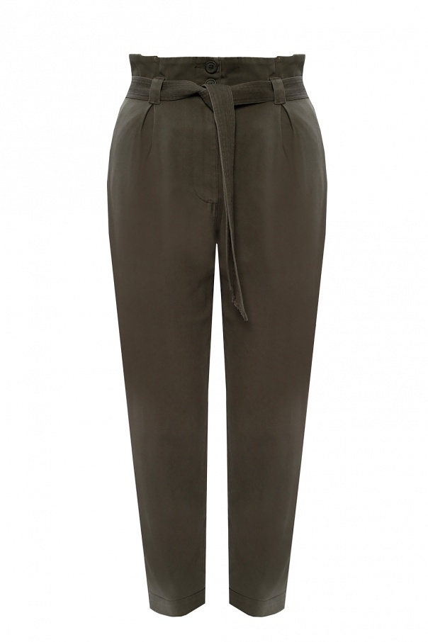 Khaki ‘Corrine’ trousers from AllSaints. Tailored to a silhouette sitting high on the waist, this cotton pair is outfitted with zip and button fastenings, a self-tie belt at the waist, two side seam pockets and legs that taper towards the ankles.