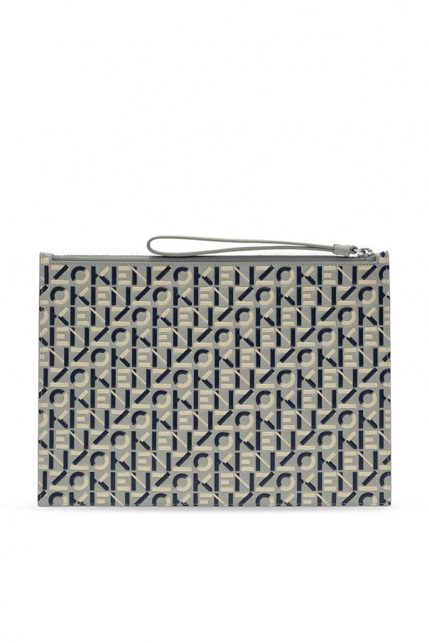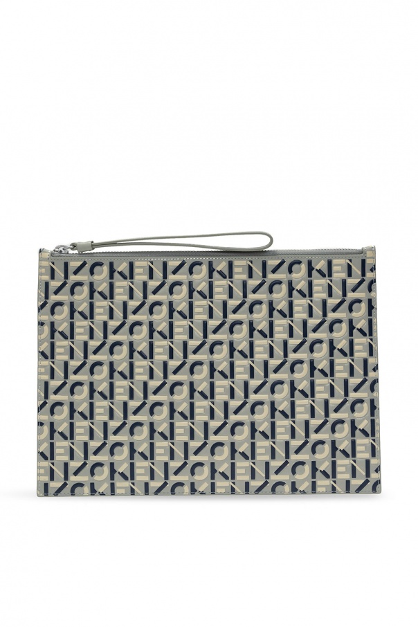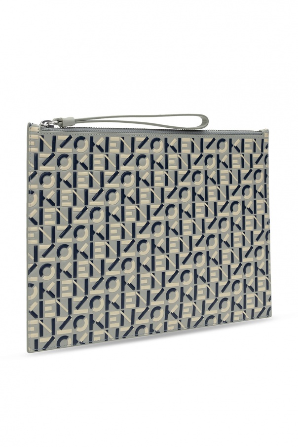 Grey clutch from Kenzo. Crafted from bovine leather, this model features a zip fastening, embossed cream and black logo, silver-tone metal hardware and one internal compartment with one slip pocket.